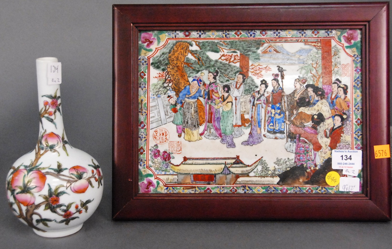 Two piece lot to include a small peach vase ht. 9in. and a framed porcelain plaque 9 x 12.