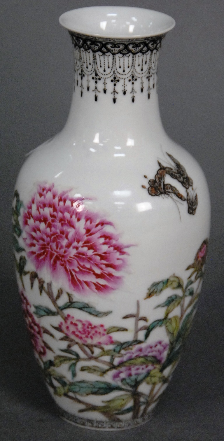 Republic period vase with blossoming flowers and butterflies, blue seal mark on bottom, ht. 7 1/2in.