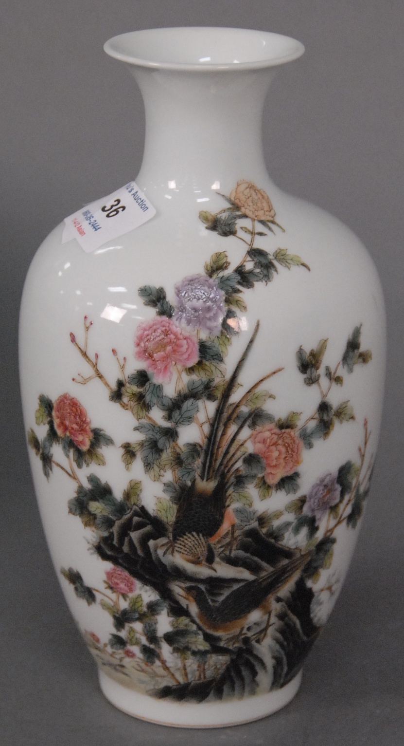 Large Famille rose vase with painted phoenix birds on each side and blossoming flowers, ht. 15 1/2in.