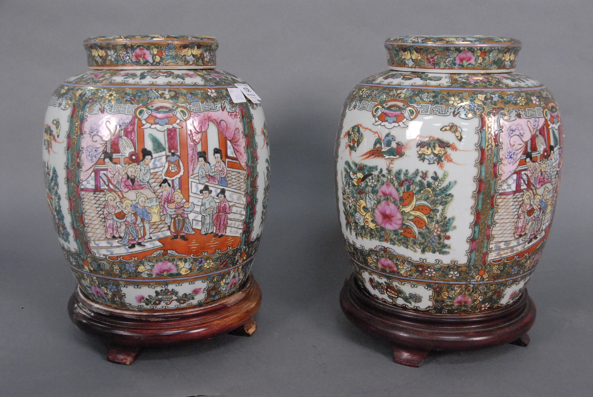 Pair of large rose medallion covered jars on stands, jar: ht. 12 1/2in.