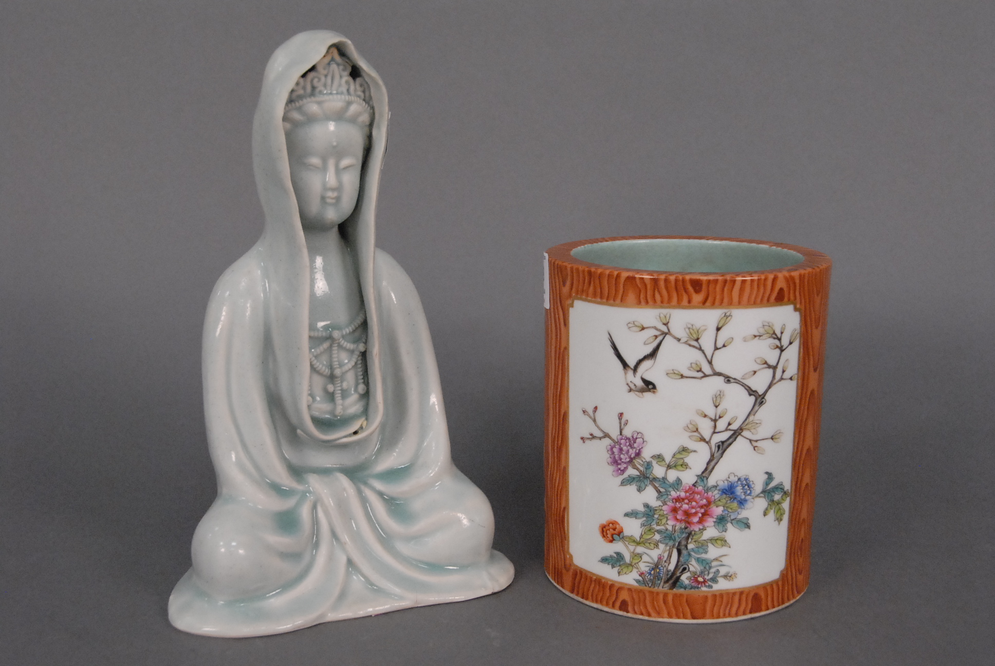 Two Oriental pieces ceramic celadon glazed Guanyin ht. 10in. and a brush pot with Qianlong mark on bottom ht. 6in. dia. 5in.