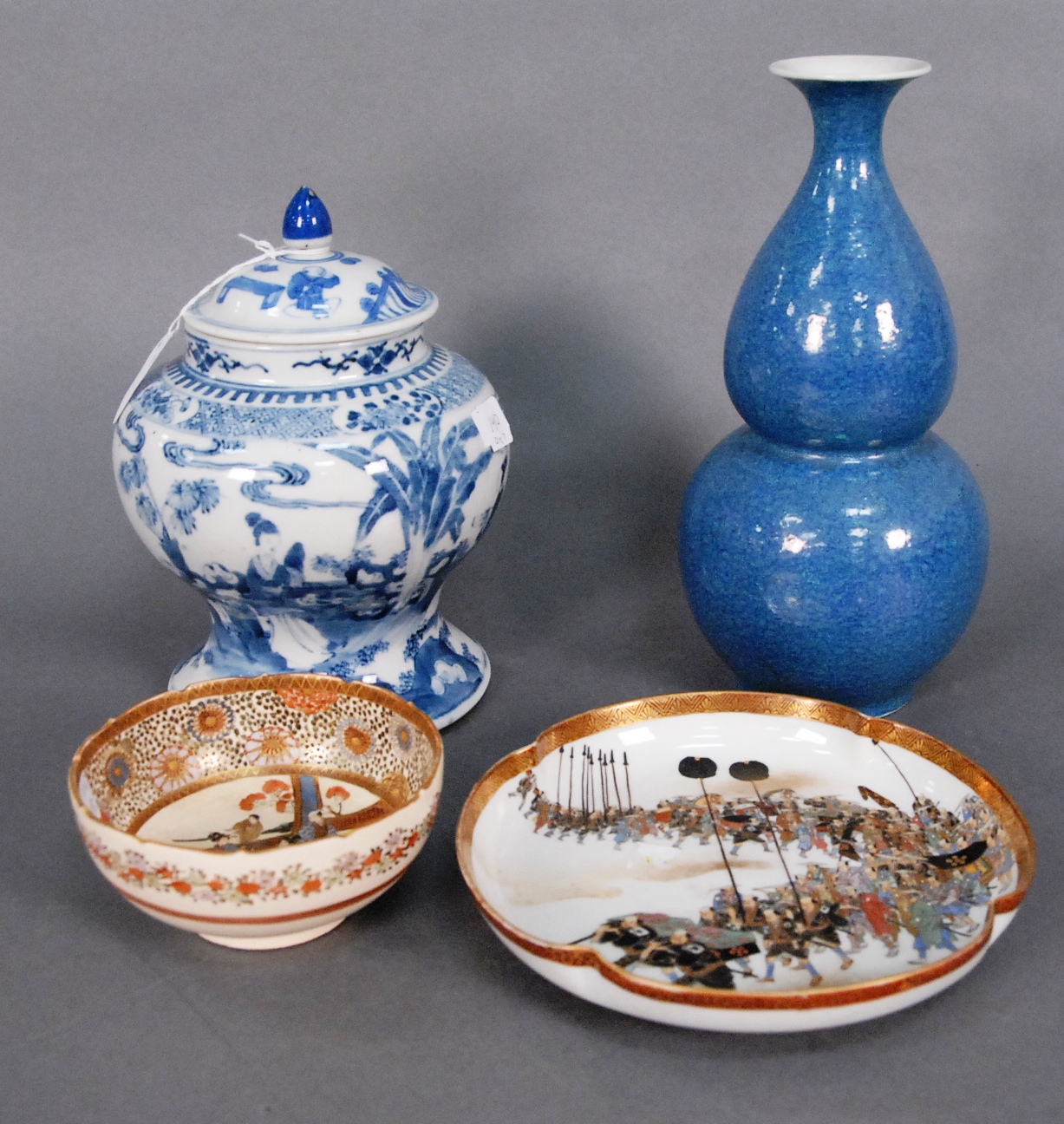 Four pieces double gourd blue glazed vase ht. 10 1/2in., blue and white small covered jar cover as is, small Satsuma bowl, and Satsuma plate dia. 8in.