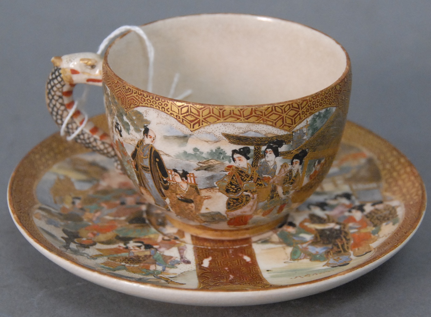 Satsuma cup and saucer with heavy gold gilt scene of warriors and Guanyin figures, saucer: dia. 5 1/2in. cup: ht. 2 1/4in.