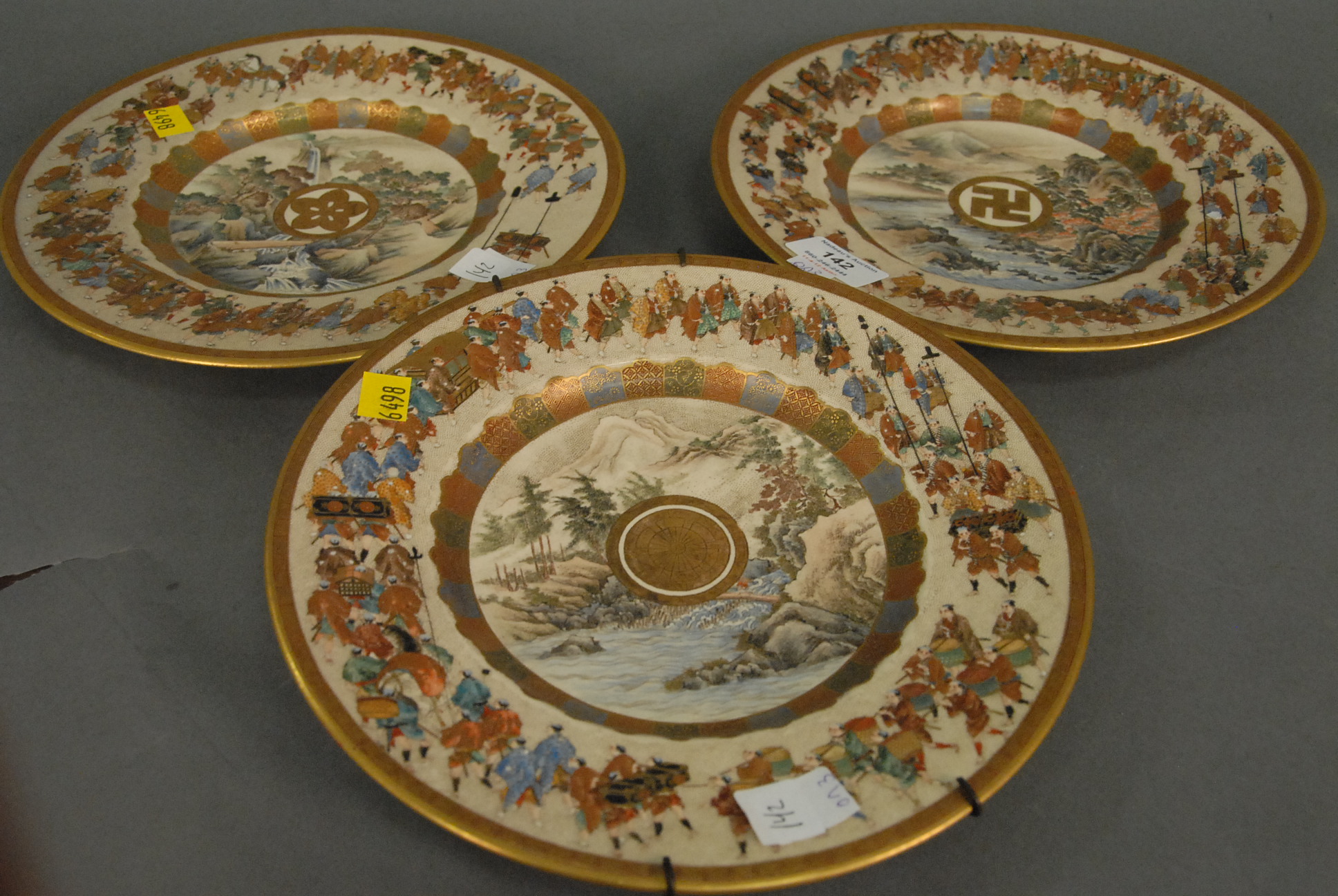 Set of three Satsuma plates having parade of men around border and landscape in the center, red and gold mark on bottom.