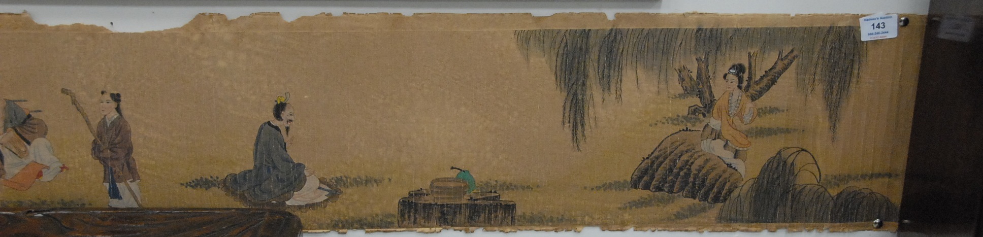 Oriental horizontal Fei, Danxu landscape scroll with figures, 9 1/2 x 95.