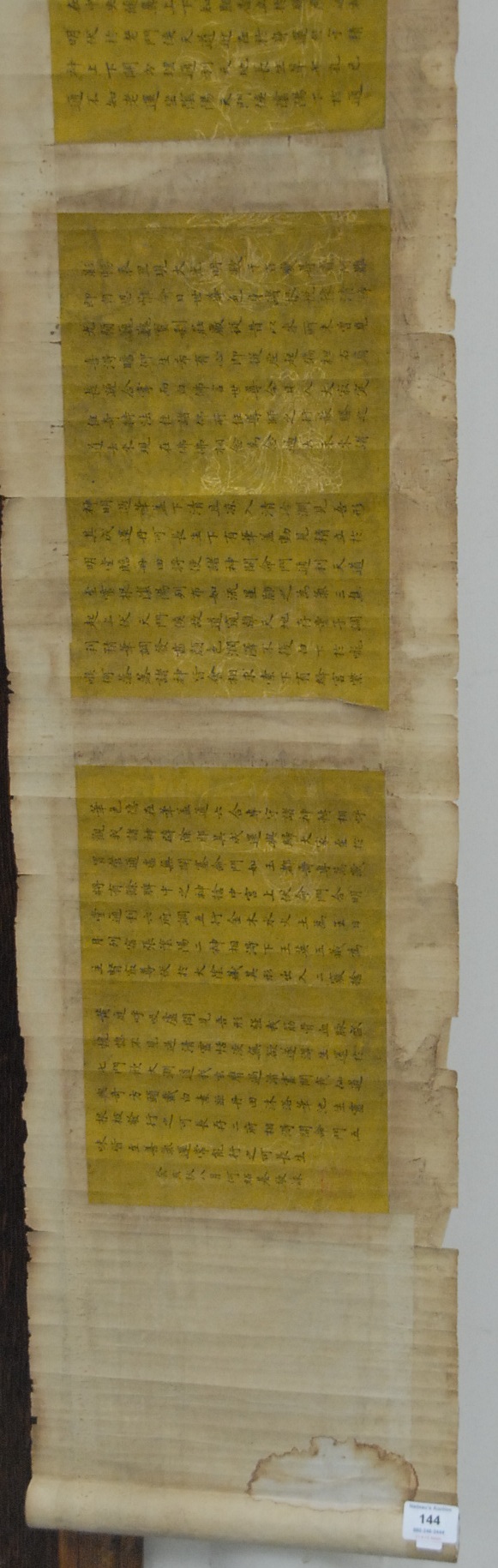 Oriental horizontal He Shaoji character scroll having seven panels with writing, 11 x 120.