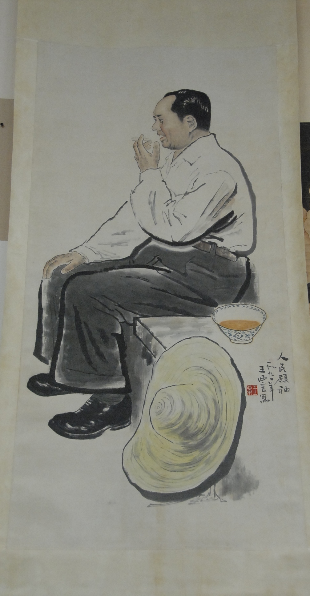 Wang Xijing figural scroll painting of a seated man smoking, 52 x 25.