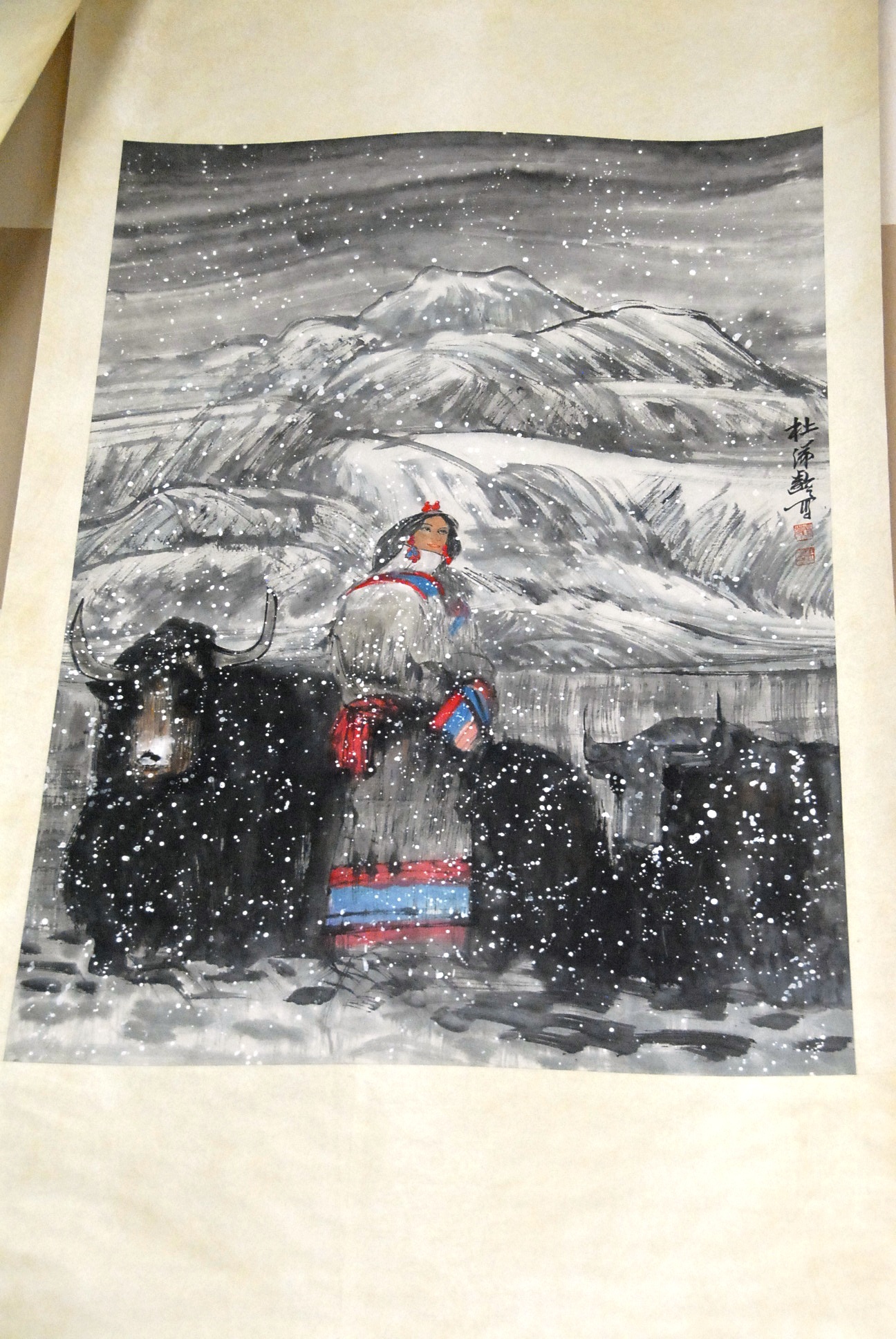 Du Zhiling landscape scroll of a woman standing next to bison in a winter storm, 36 x 26.