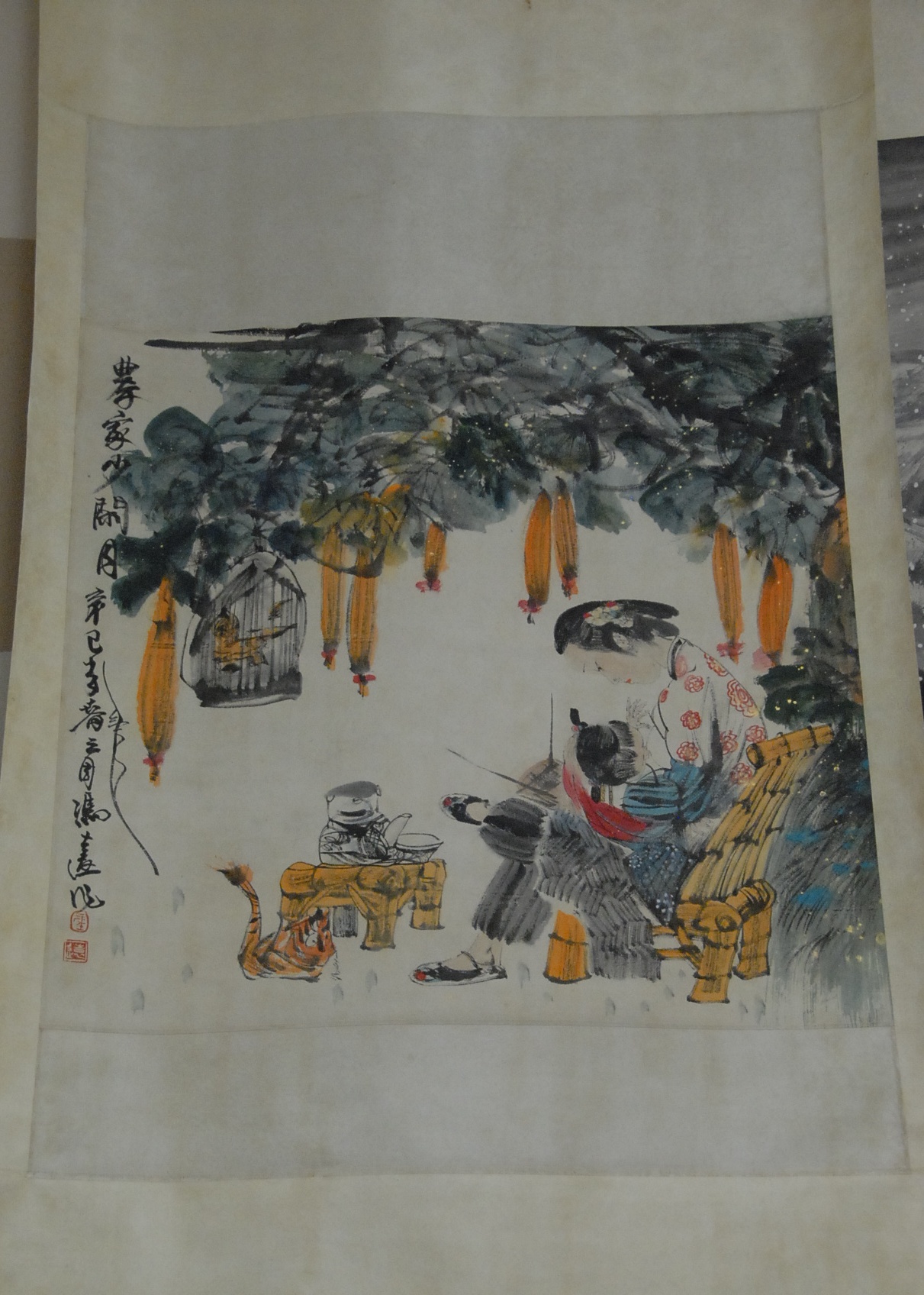Feng Yuan Oriental scroll of a woman with child, 39 x 26.