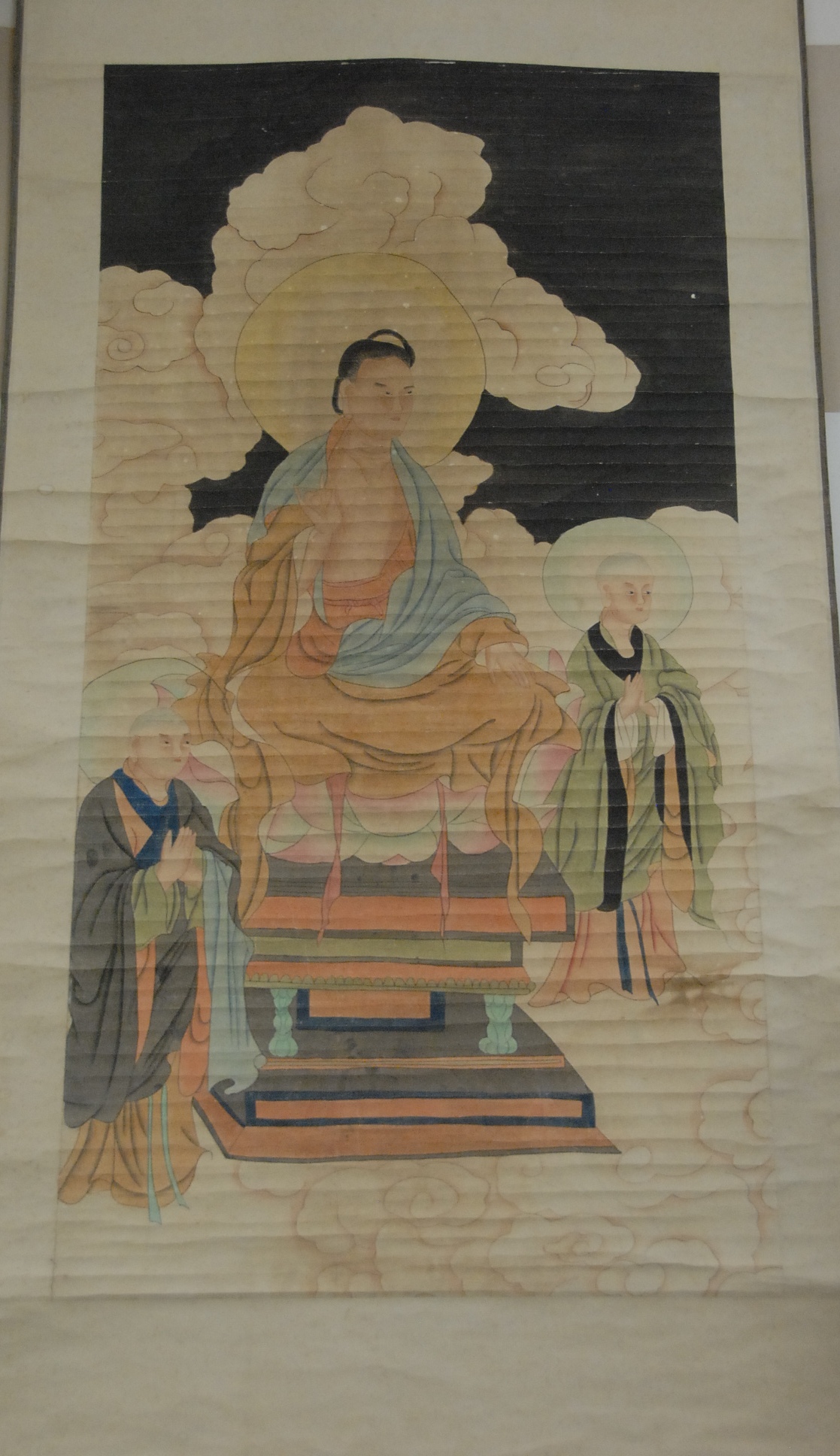 Oriental scroll watercolor on paper of seated figure and two standing figures with cloudy background, 48 x 24.