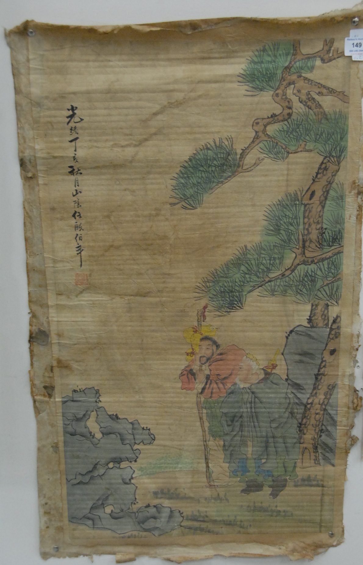 Two Oriental scrolls one with scholar figures in landscape 35 x 21 and the other with Guanyin figure and warrior figure 36 x 20.
