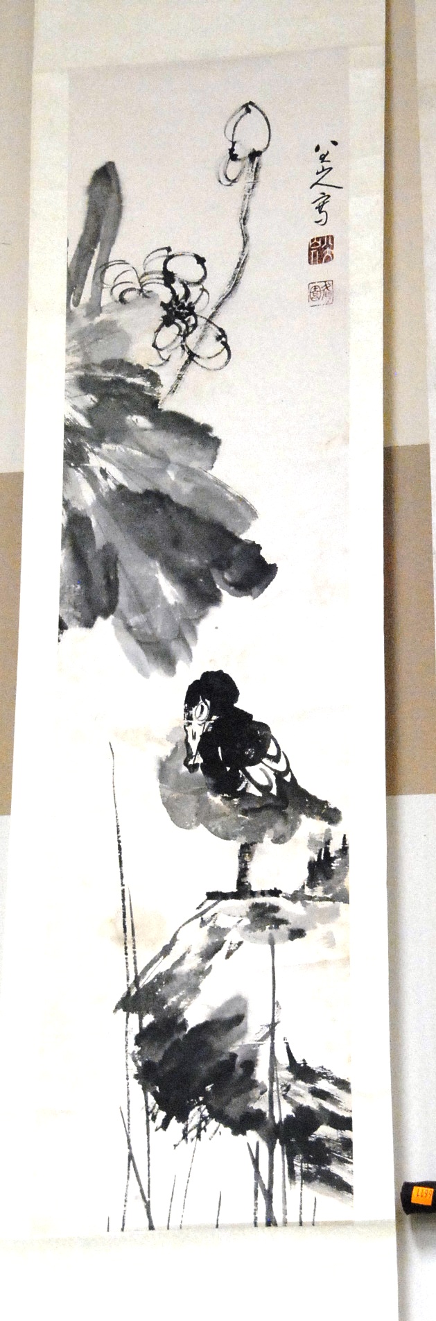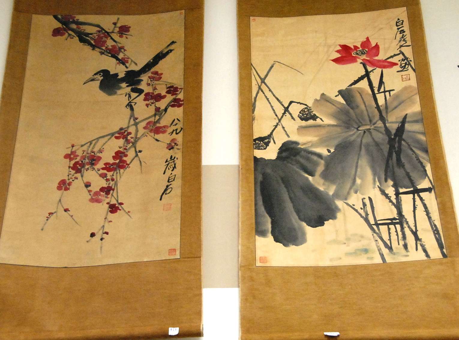 Two Oriental scroll paintings on paper one of bird sitting on blossoming cherry tree and the other of lotus with blossoming flower, 37 x 20.