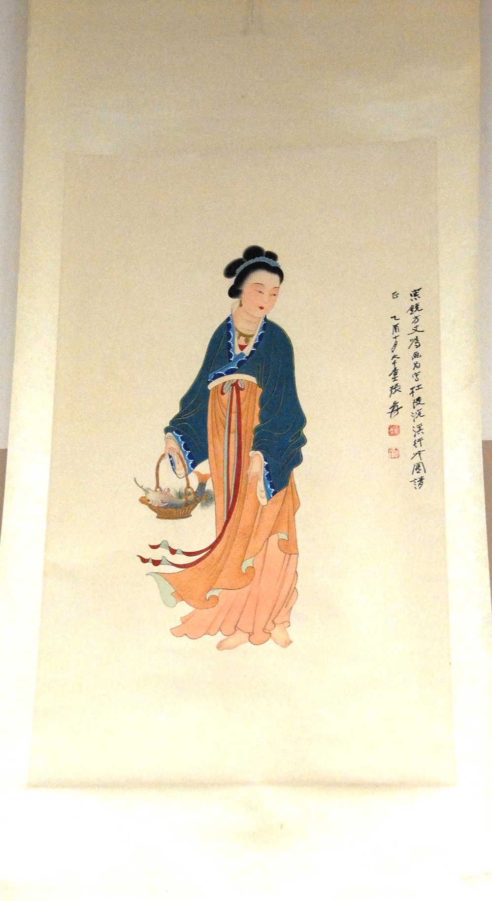 Zhang Daqian scroll of Guanyin standing with basket, 36 x 21.