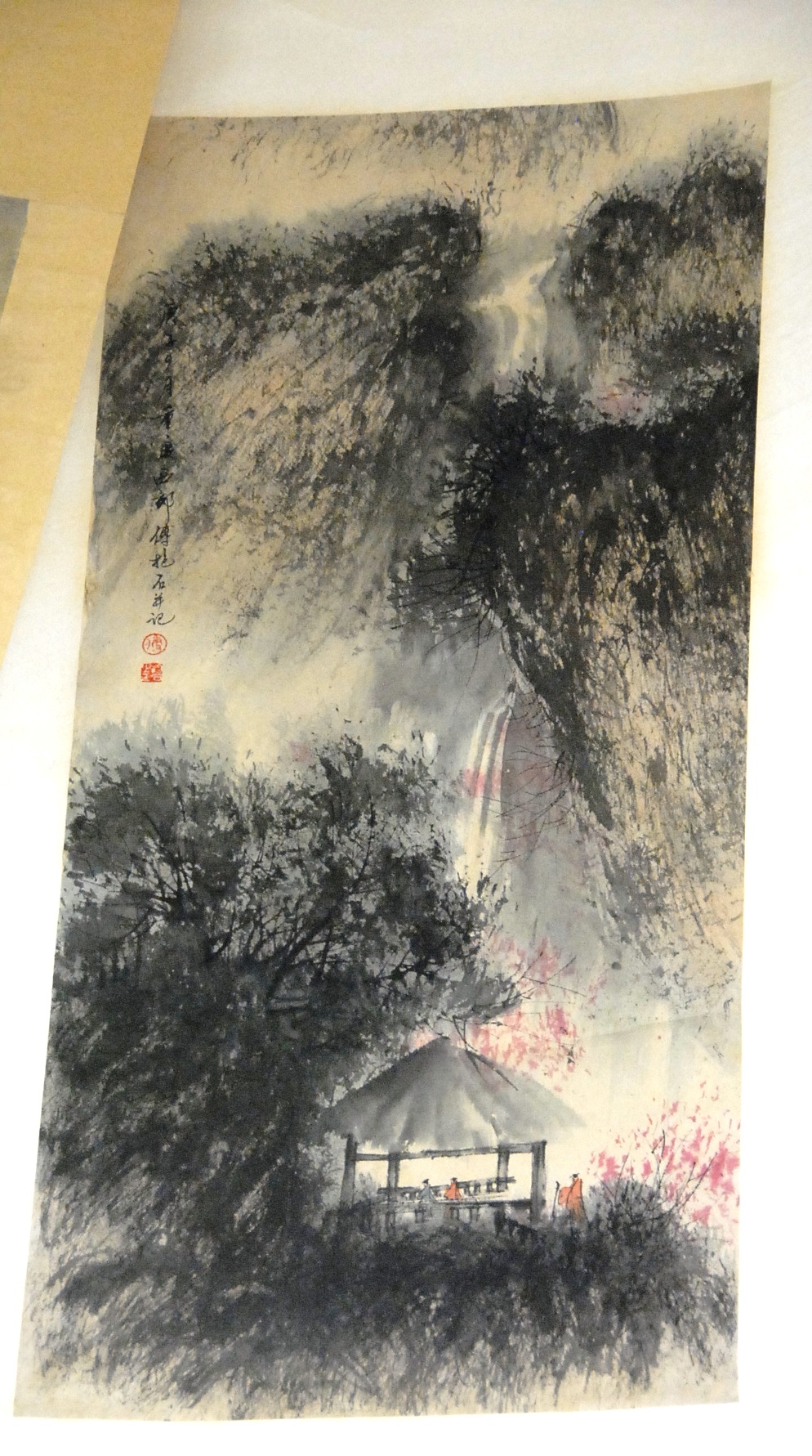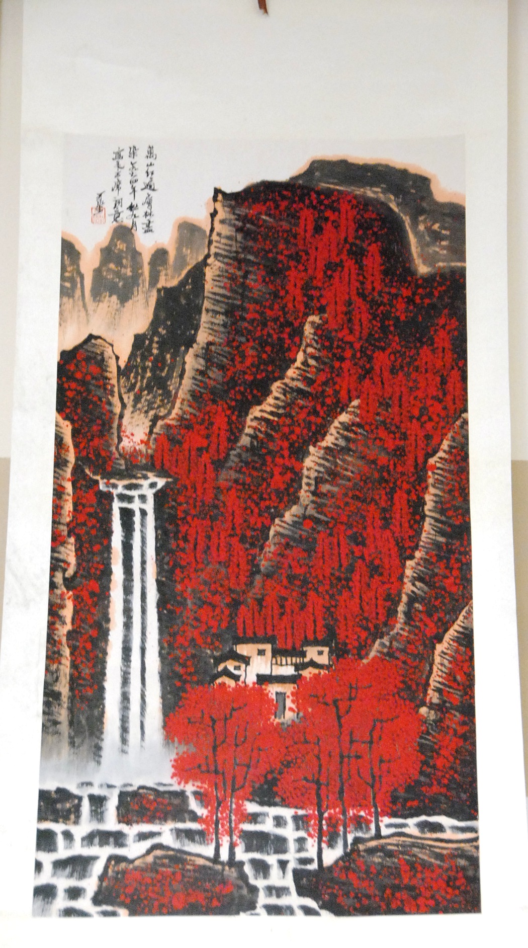 Kenyan Li scroll landscape with red trees, 38 x 19.