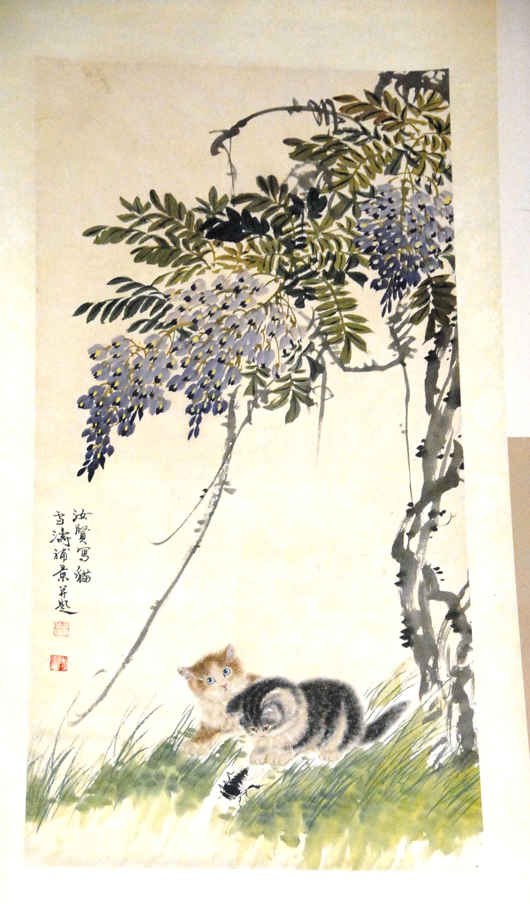 Wang Xuetao scroll of kittens playing under flowering tree, 39 x 19.