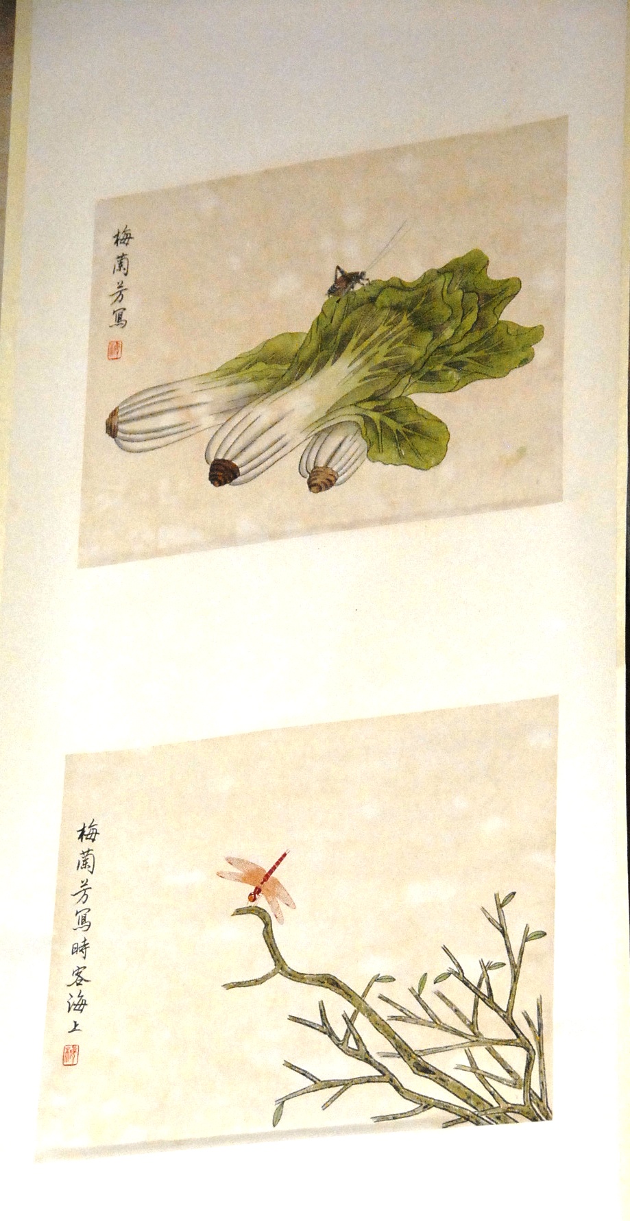 Mei Lan Fang two part scroll having grasshopper of lettuce and the other with dragonfly on stick, scroll size: 69: x 22.
