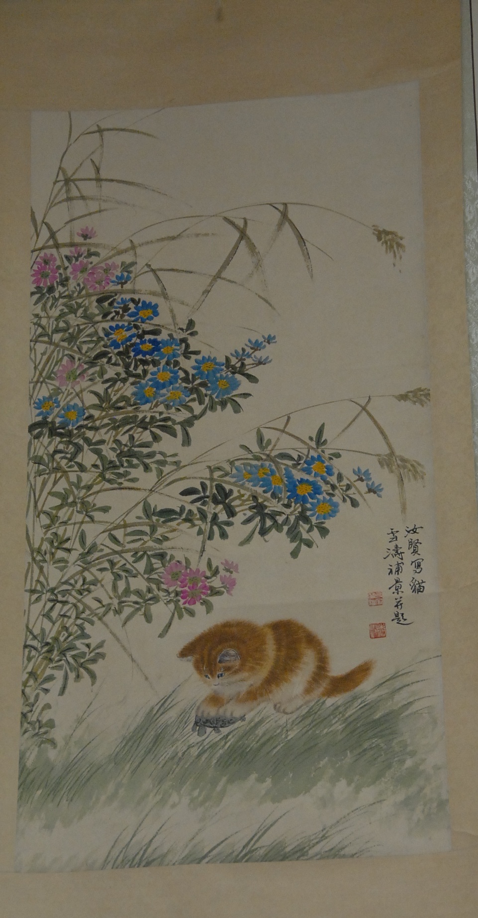 Wang Xuetao scroll with flowers and kitten, 38 x 12.