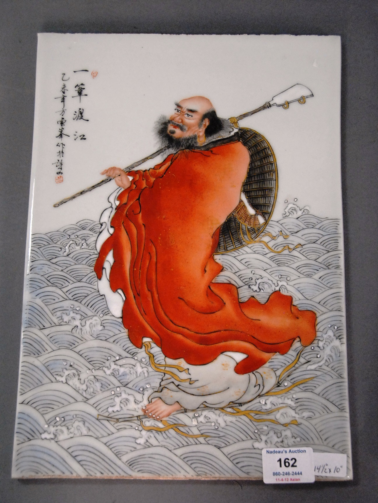 Oriental painting on porcelain plaque of warrior figure standing on rolling and crashing waves, ht. 14 1/2in. wd. 10in.