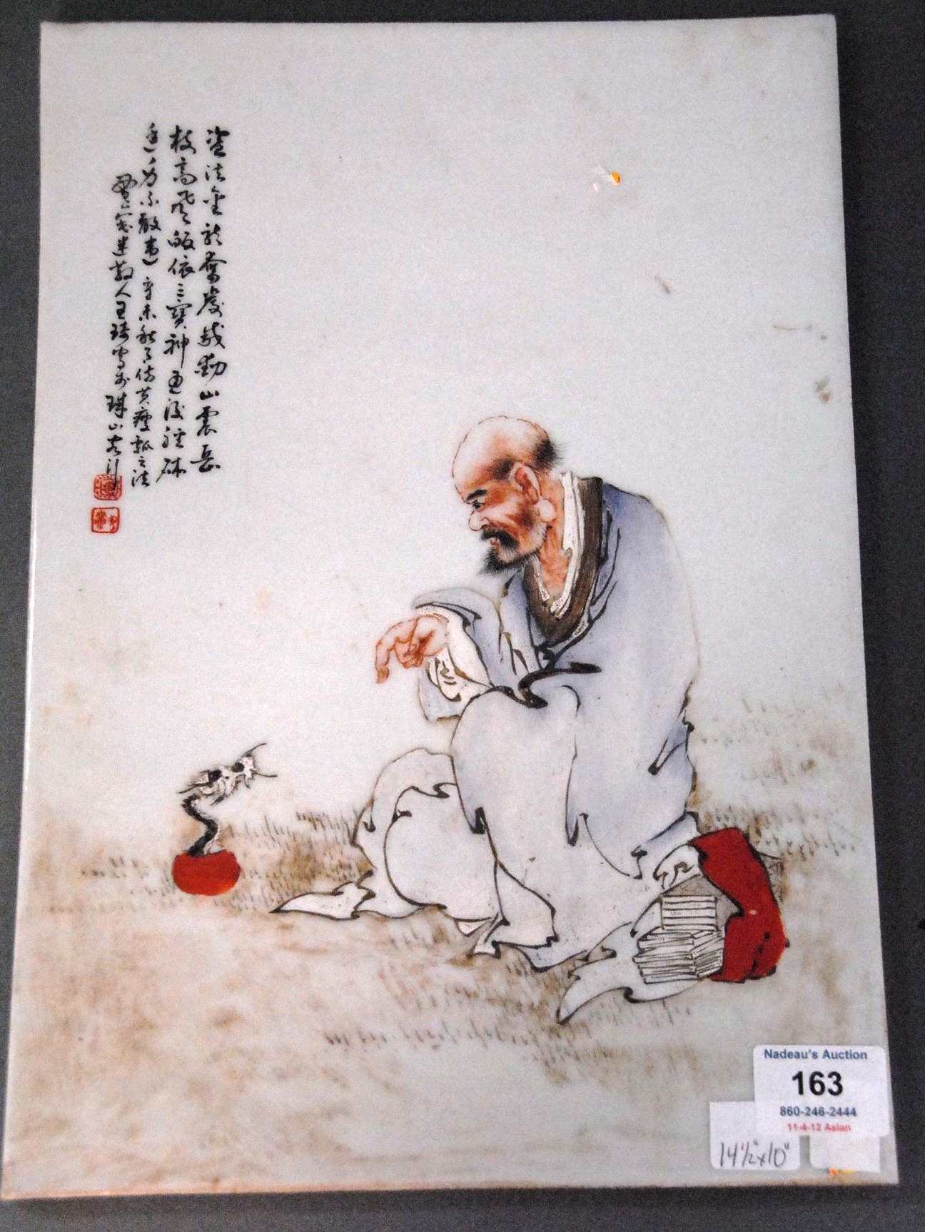 Porcelain plaque of a scholar with a small dragon, 14 1/2 x 10.