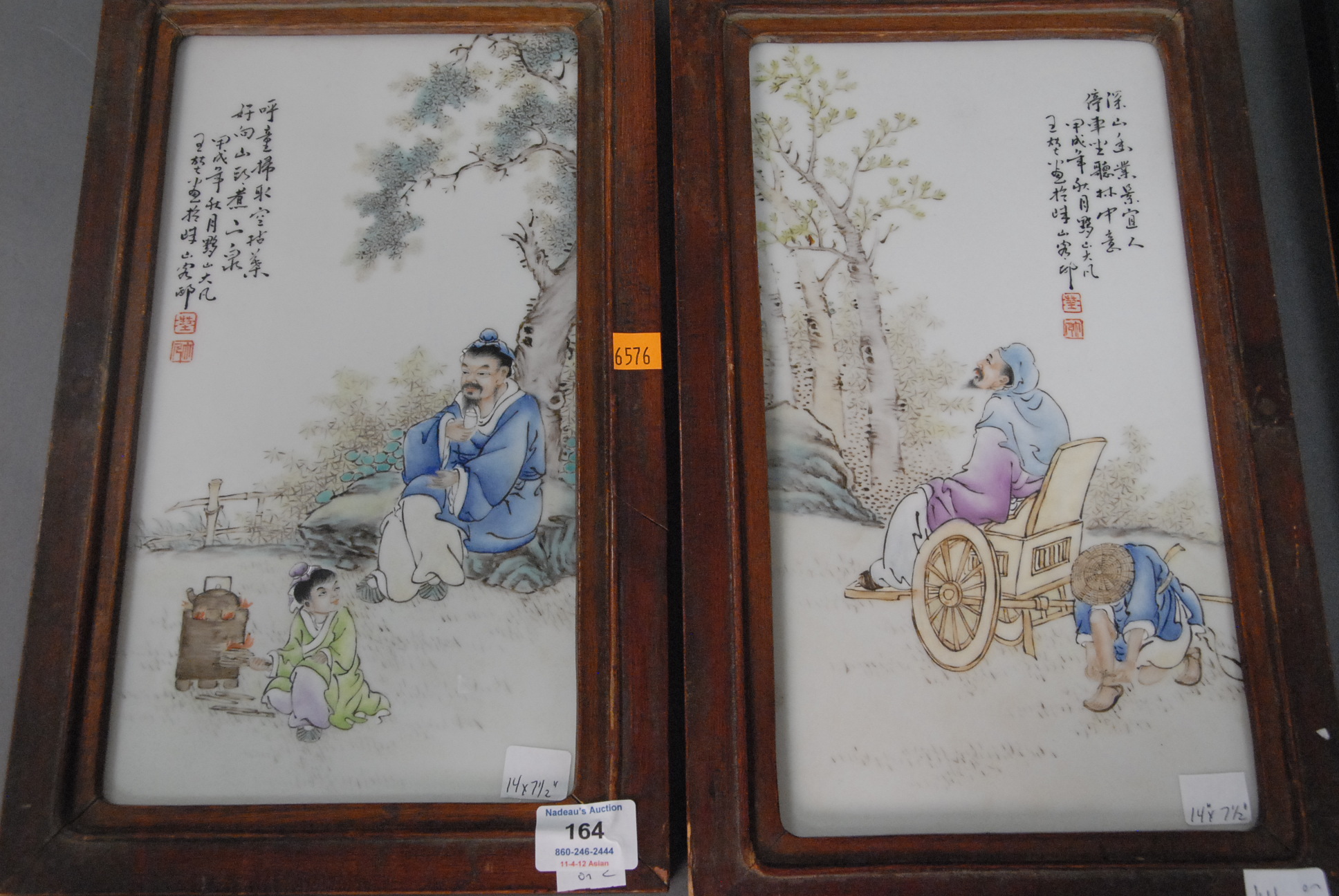 Pair of Famille rose framed Oriental plaques of scholar with a young girl, 14 x 7 1/2.