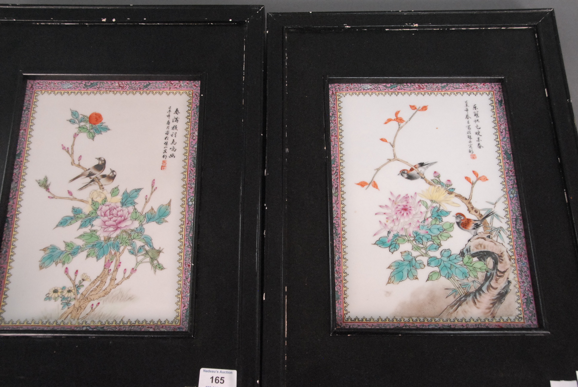 Pair of Rose famille framed porcelain plaques with painted wild flowers and birds, 12 1/2 x 9.