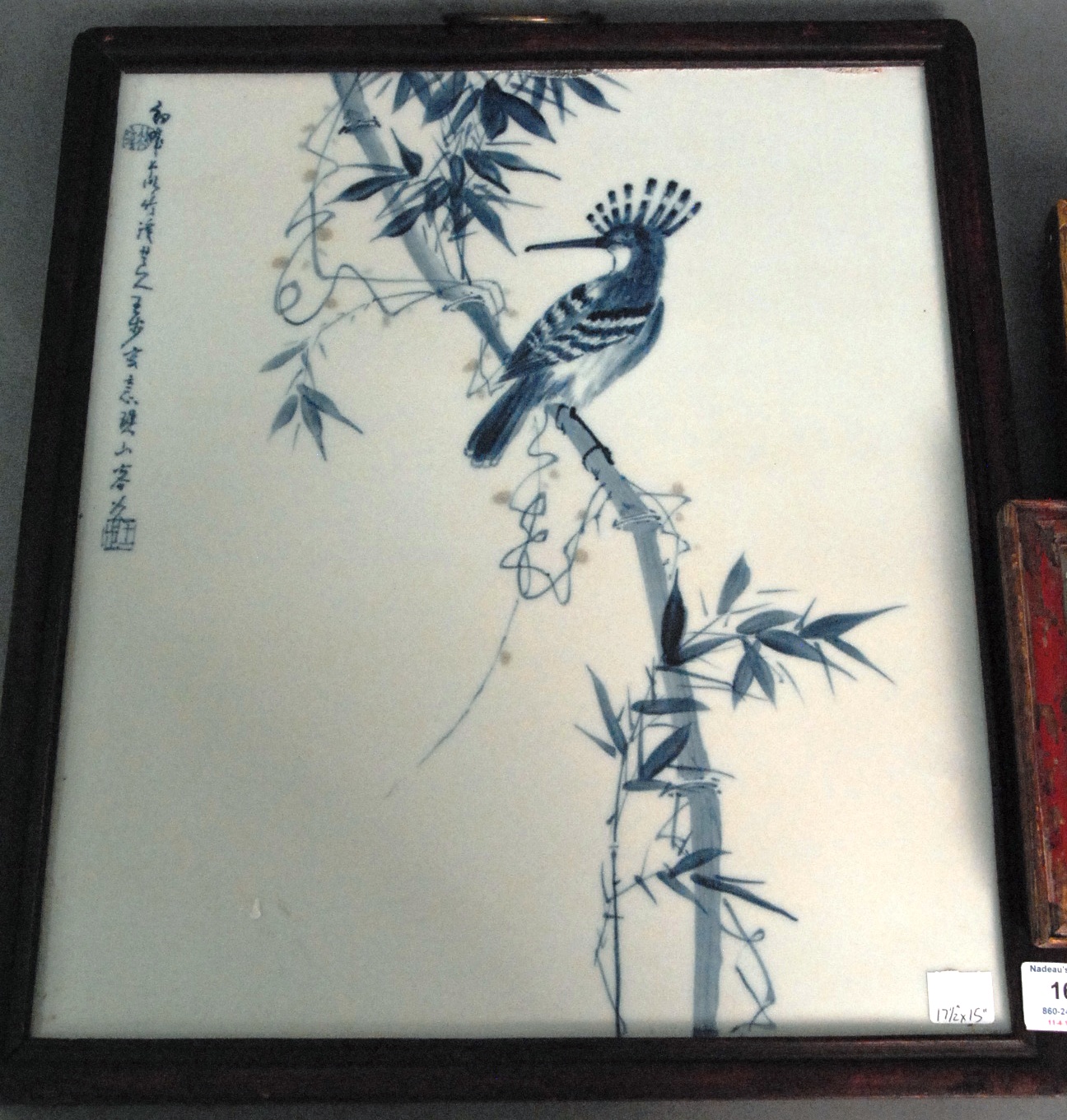Blue and white porcelain plaque of a bird in a branch, 17 1/2 x 15.