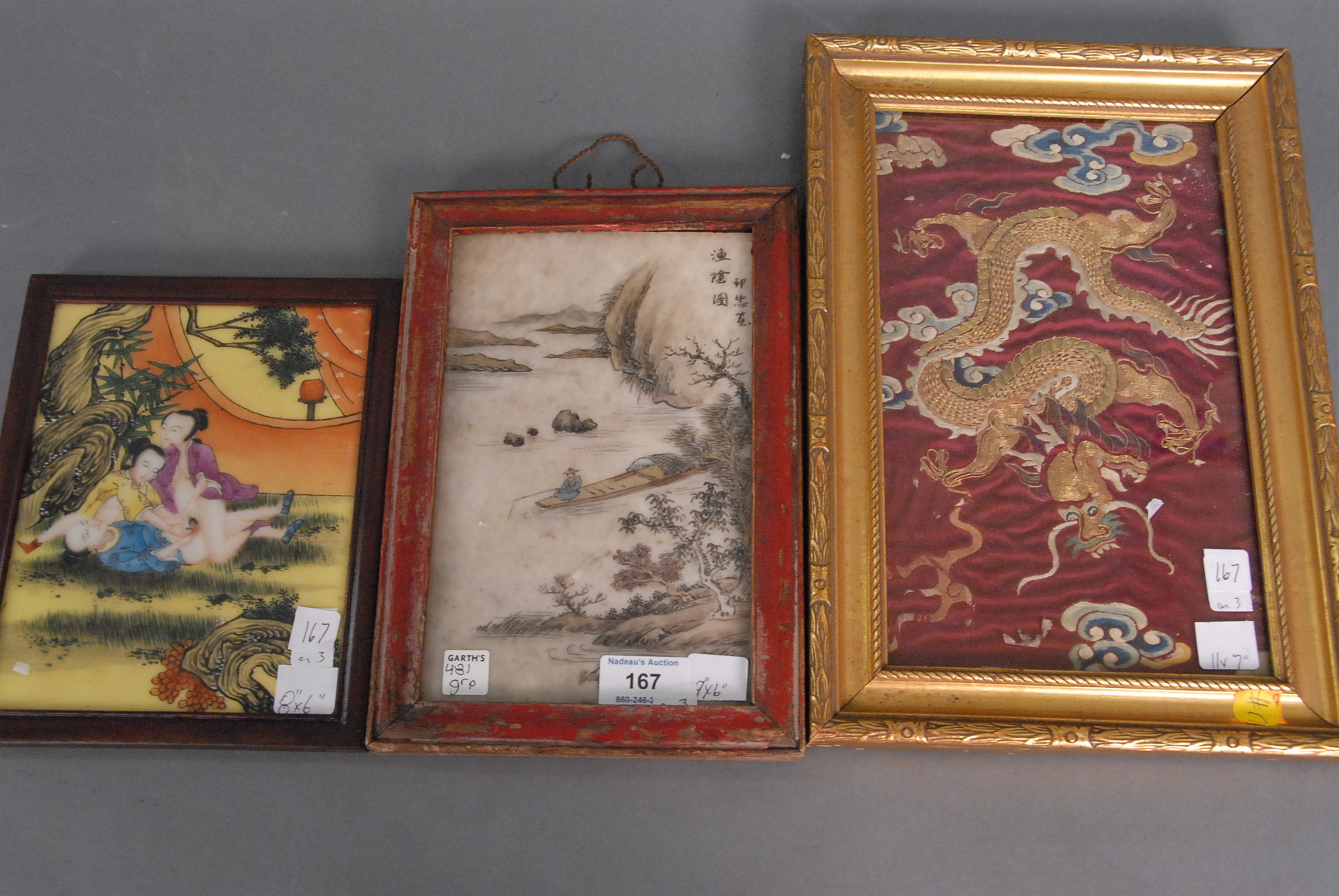 Group of three framed pieces erotic porcelain plaque 8 x 6, painting on stone landscape 9 x 6, and stitched dragon on silk 11 x 7.