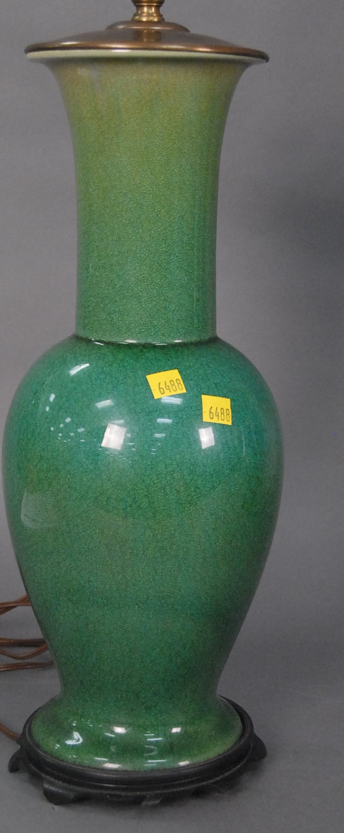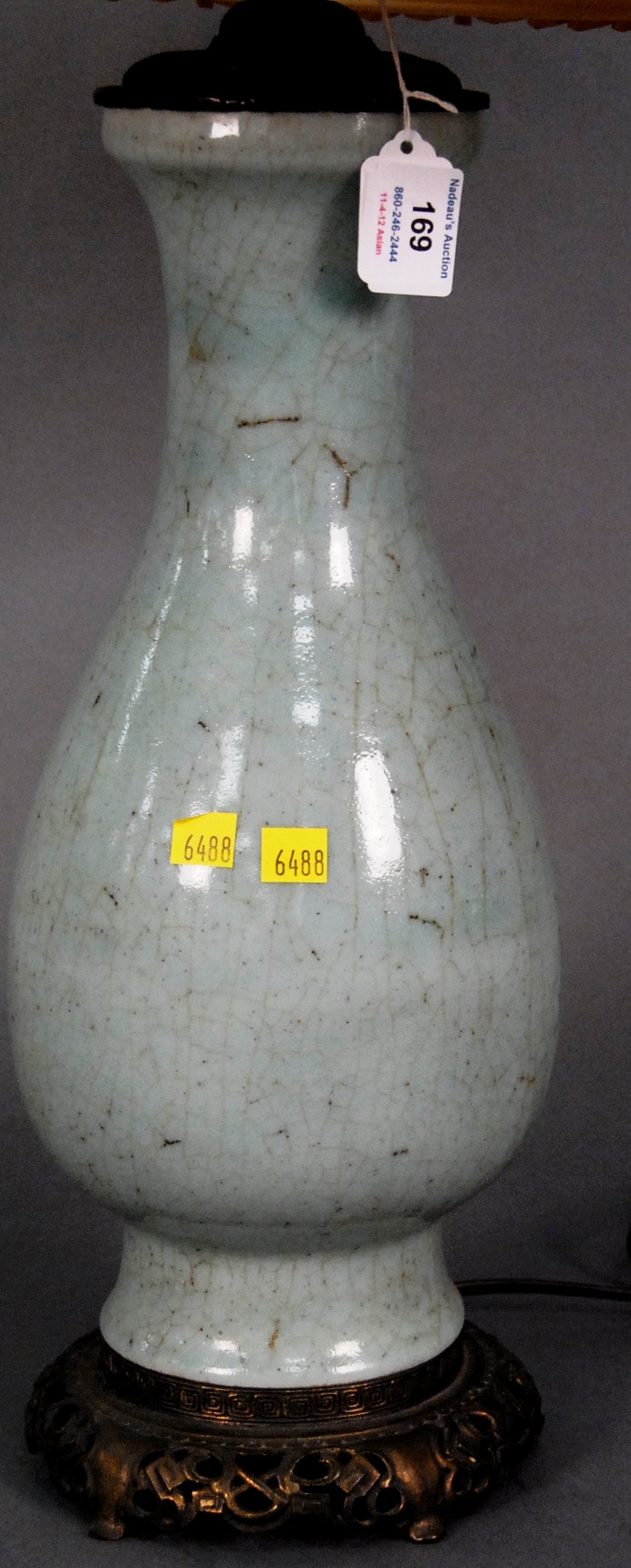 Crackle celadon glazed vase made into a table lamp with bronze cover and metal base, ht. 16in.