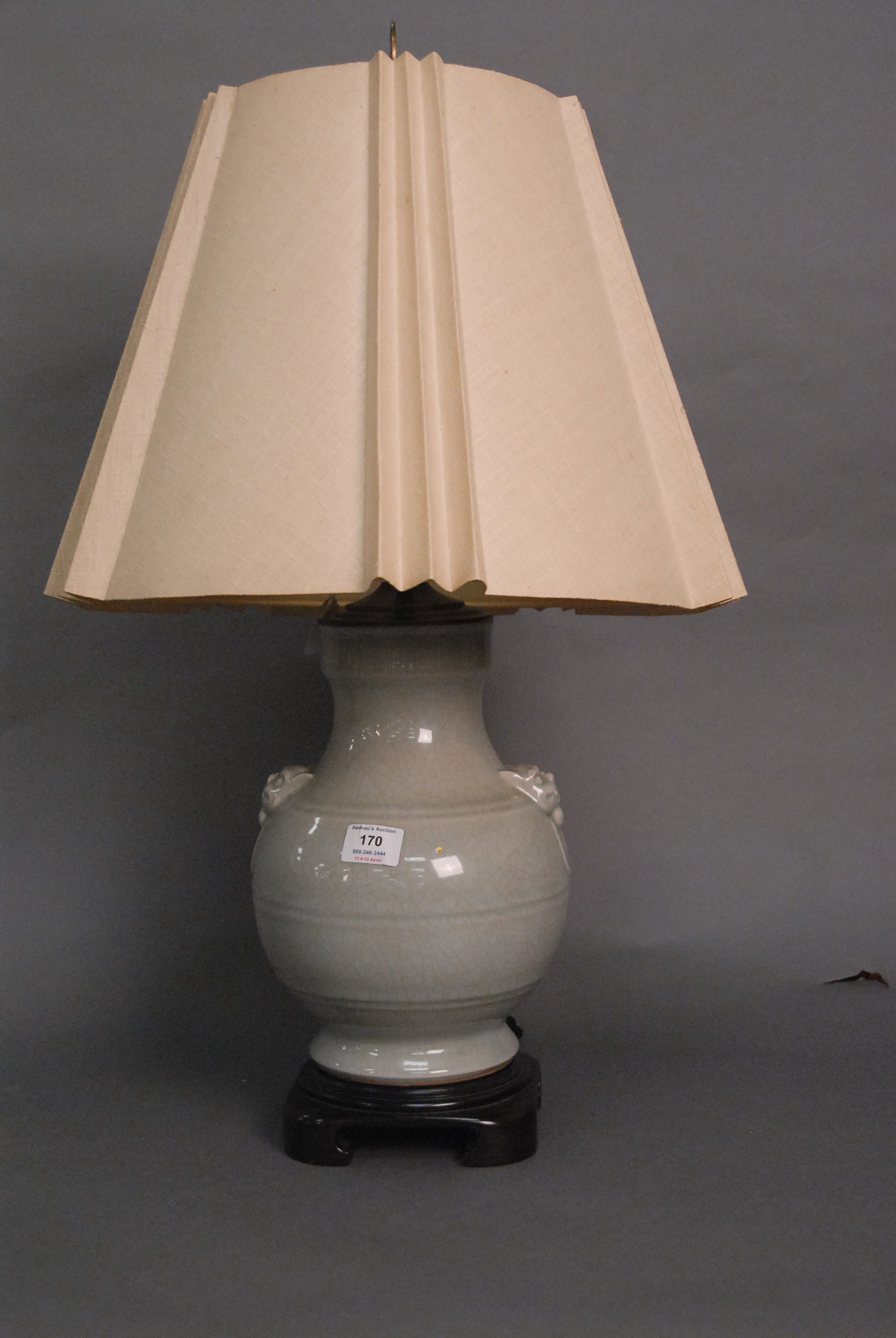 Crackle celadon glazed vase with molded foo dog head handles made into a table lamp, ht. of vase: 12in.