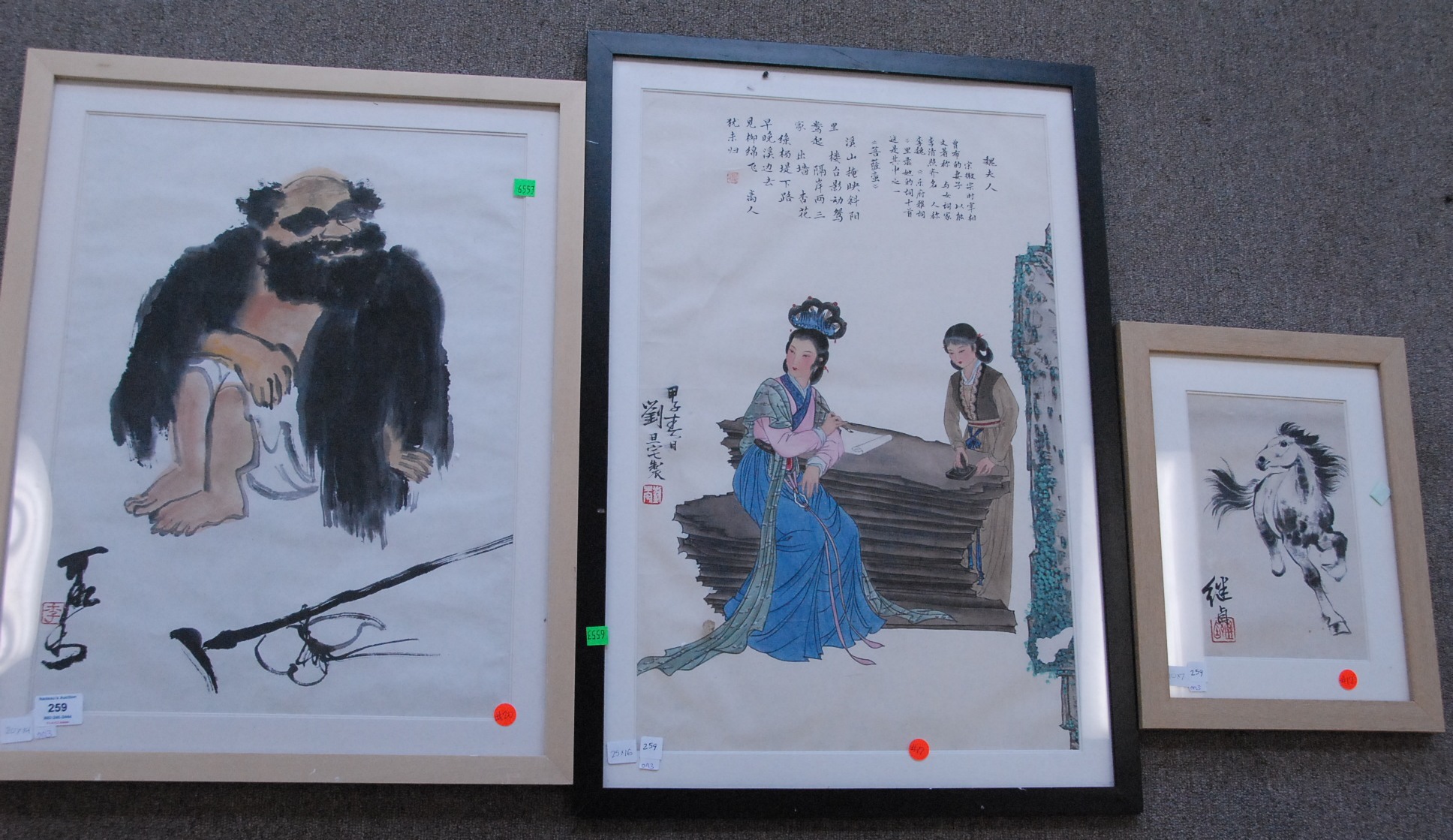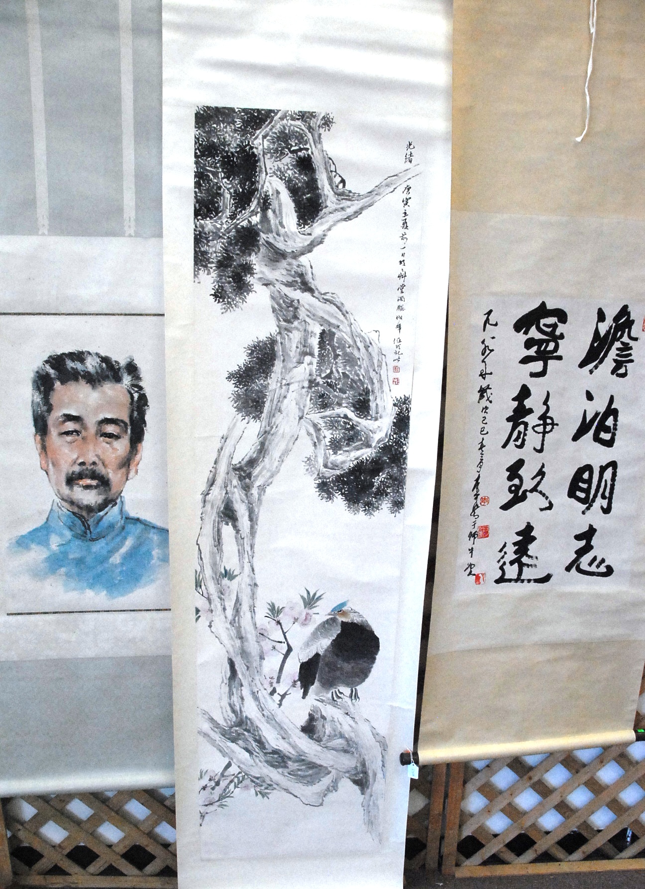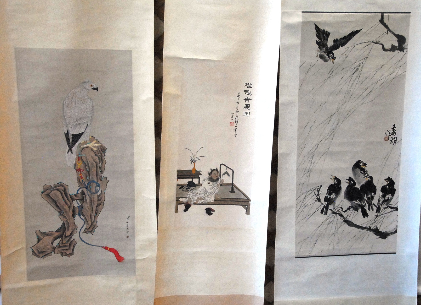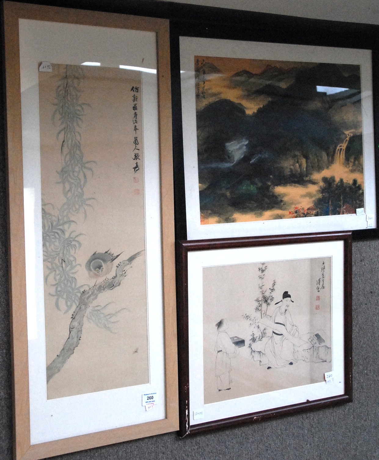 Three Oriental scrolls watercolor on paper landscape 14 x 19, watercolor on silk bird on branch 26 x 9, and watercolor on paper sketch man and Guanyin 12 x 14.