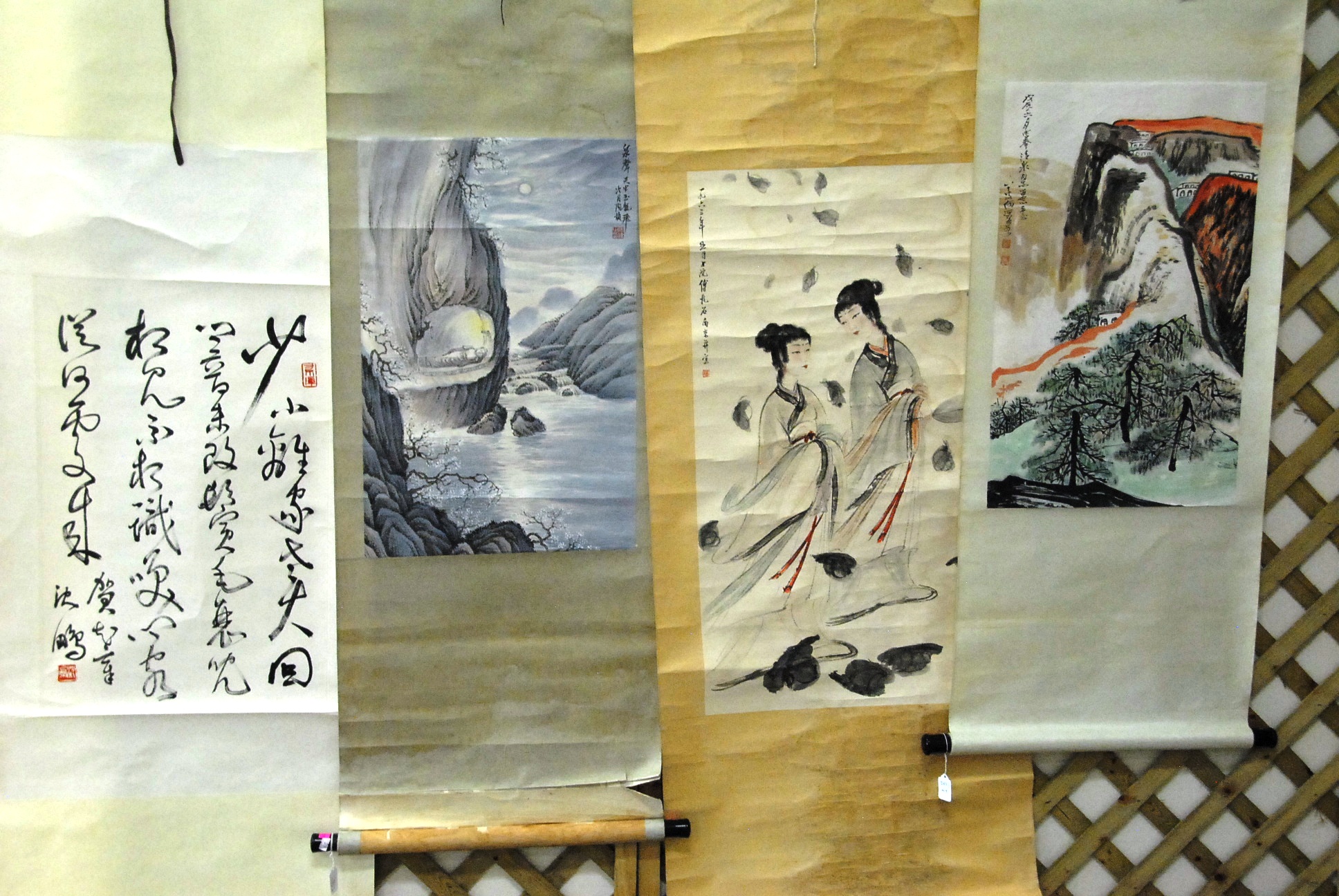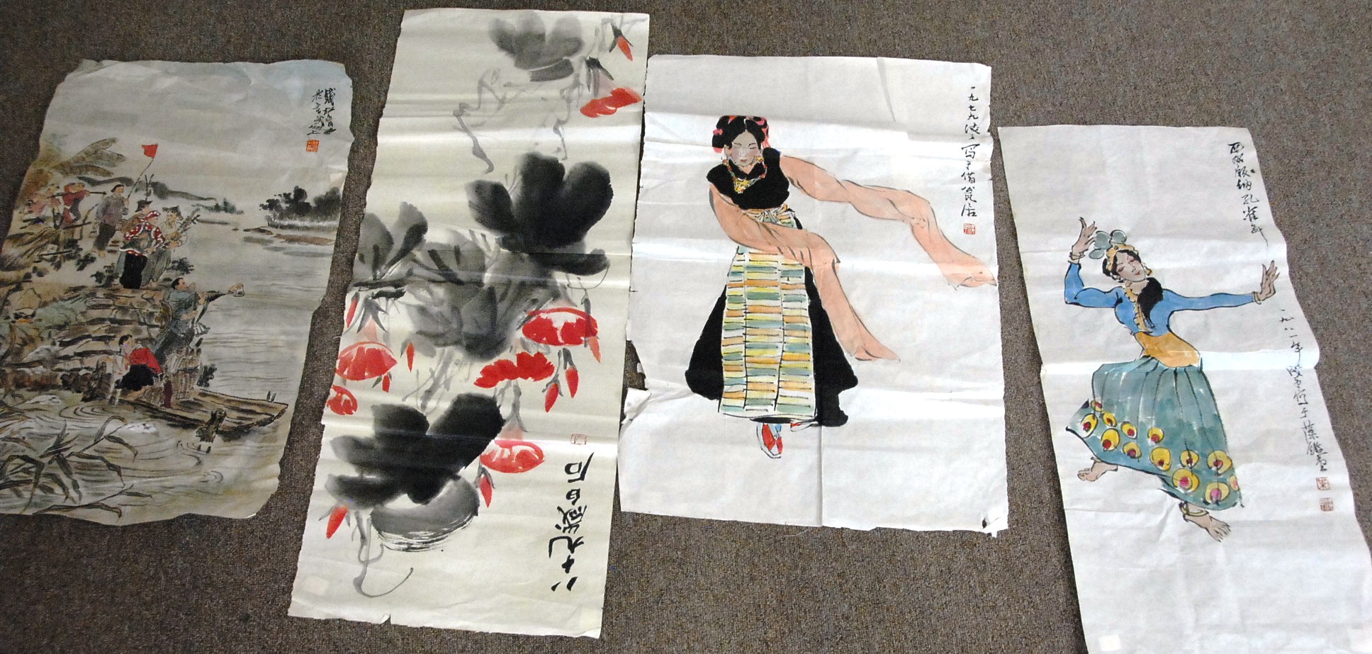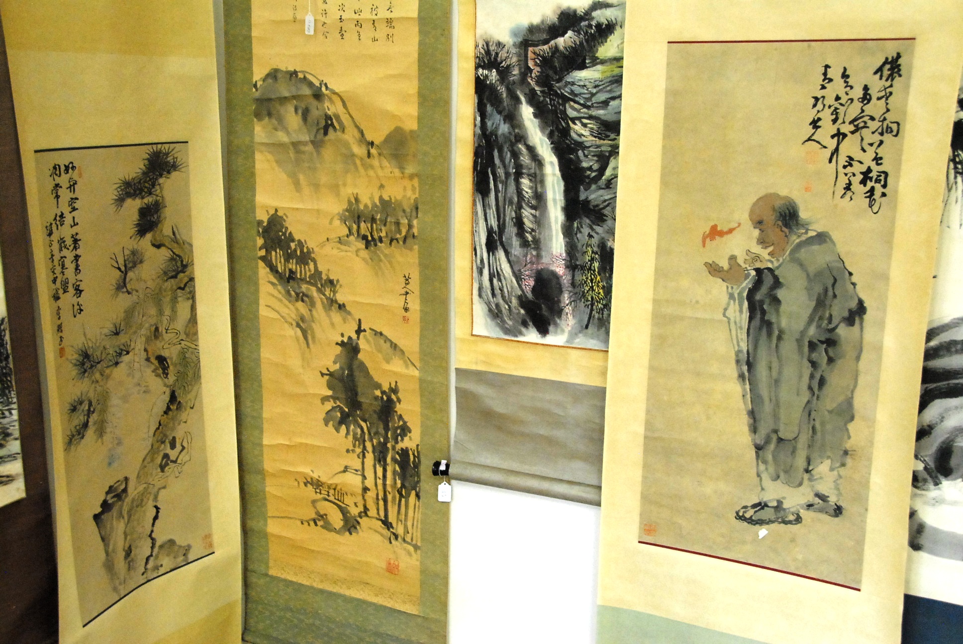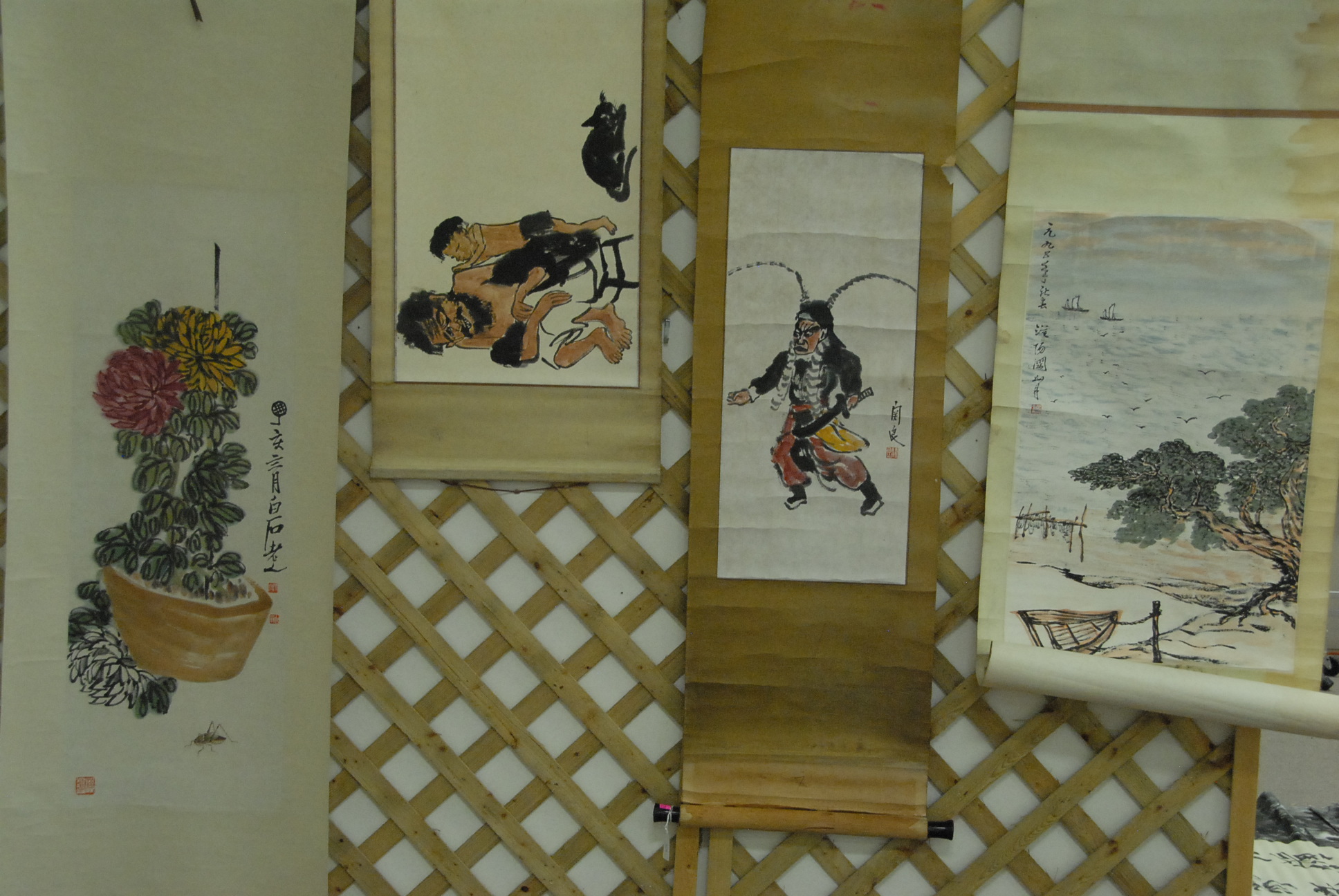 Four Oriental scrolls watercolor still life plant 37 x 13, watercolor beach landscape 26 x 16, watercolor boy with father 15 x 25, and watercolor of warrior 26 x 11.