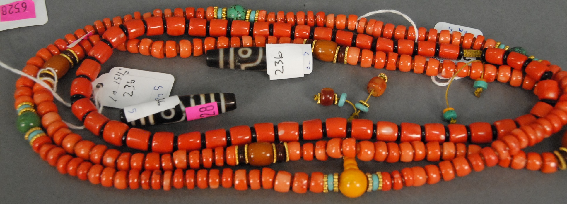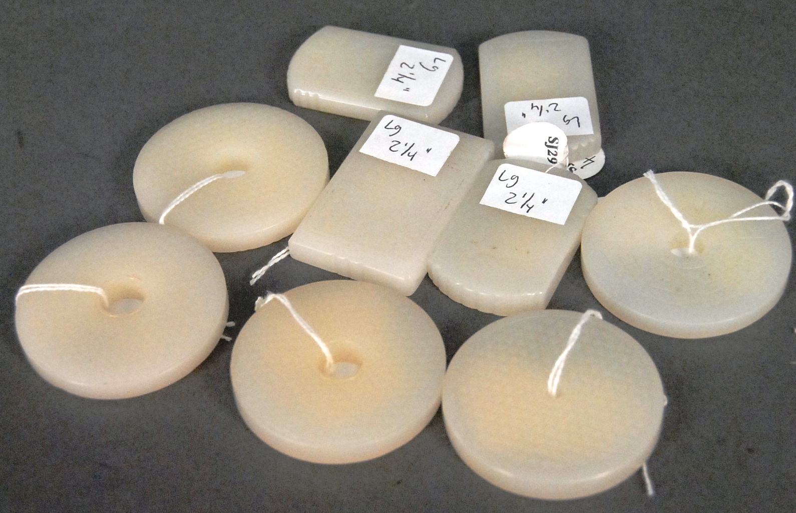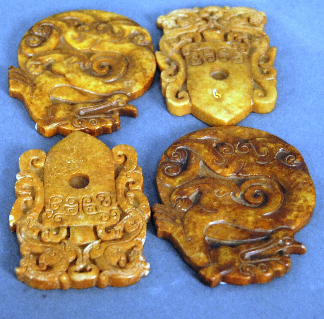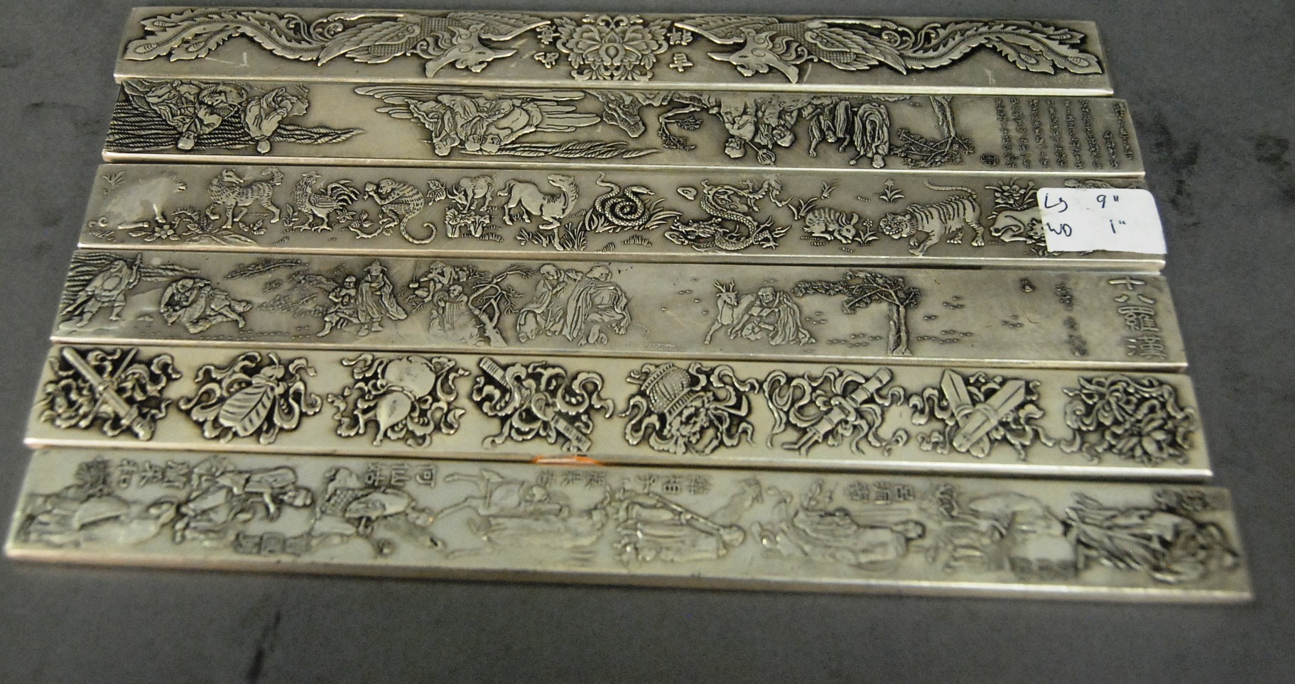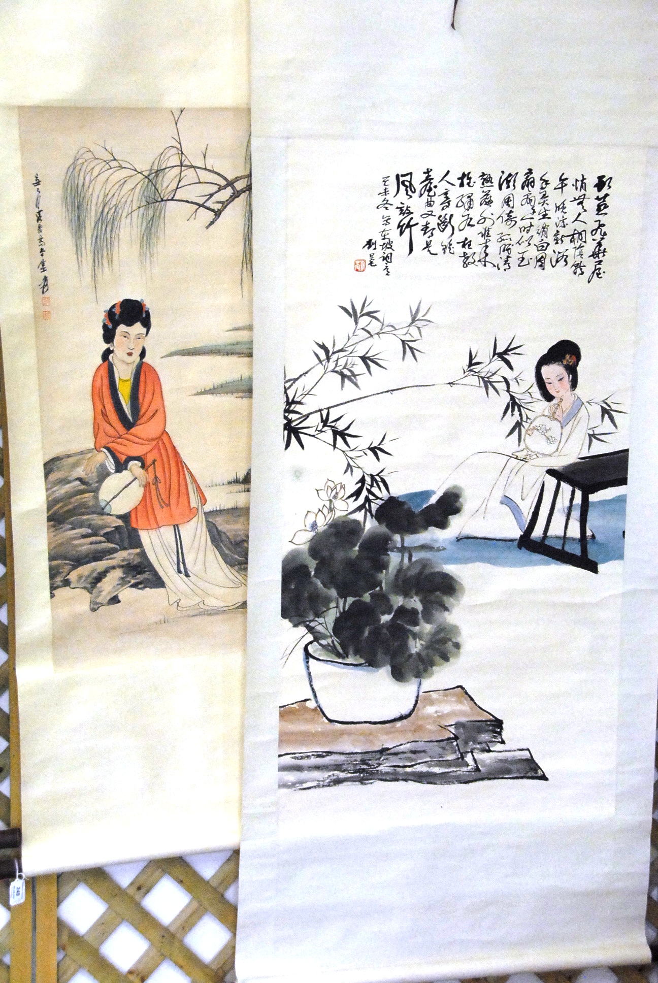 Four Oriental scrolls watercolor still life plant 37 x 13, watercolor beach landscape 26 x 16, watercolor boy with father 15 x 25, and watercolor of warrior 26 x 11.