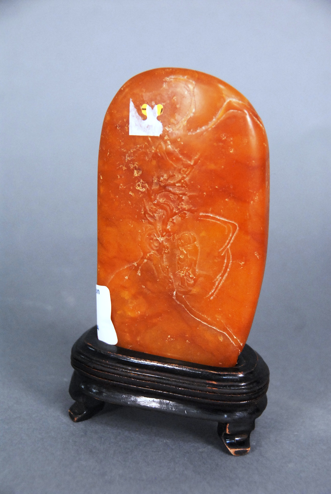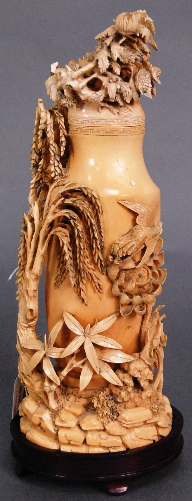 Large carved ivory covered urn having carved wild flowers and lotus on one side with flying birds and crane and a large carved tree going up one side of the urn to the cover which is carved with wild flowers as is, base marked with two character Qianlong mark, ht. 11 1/4in. plus stand.