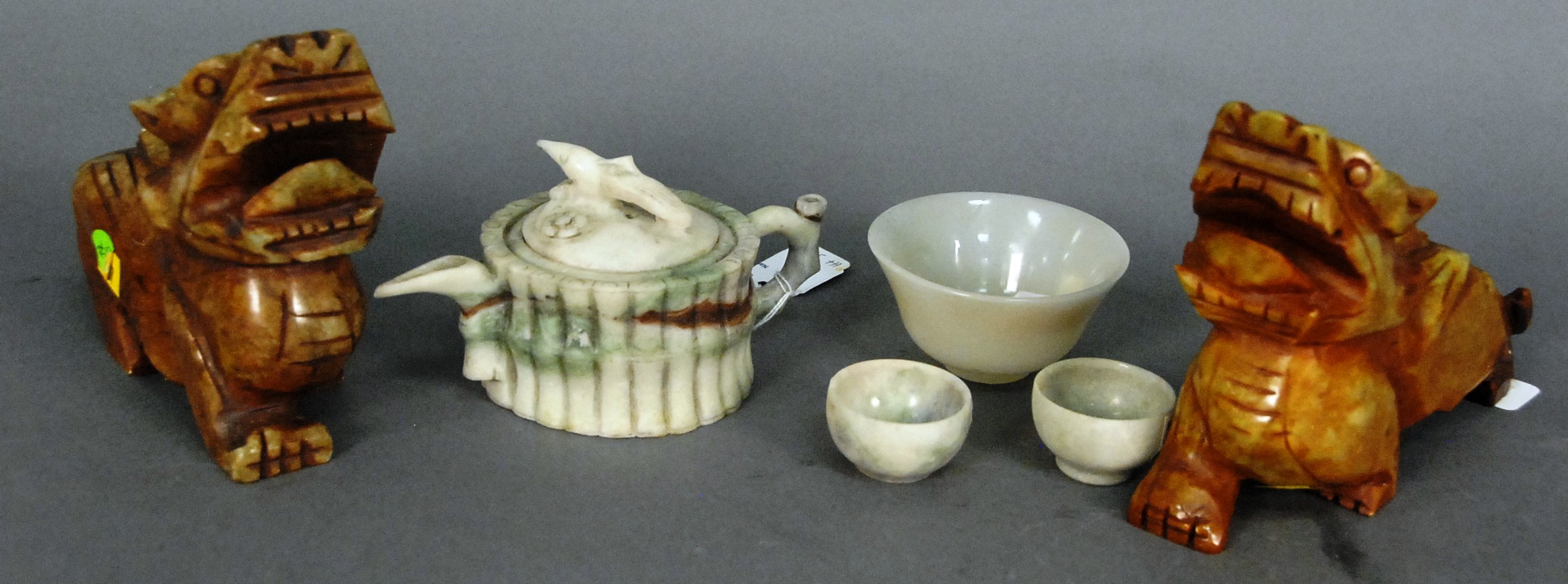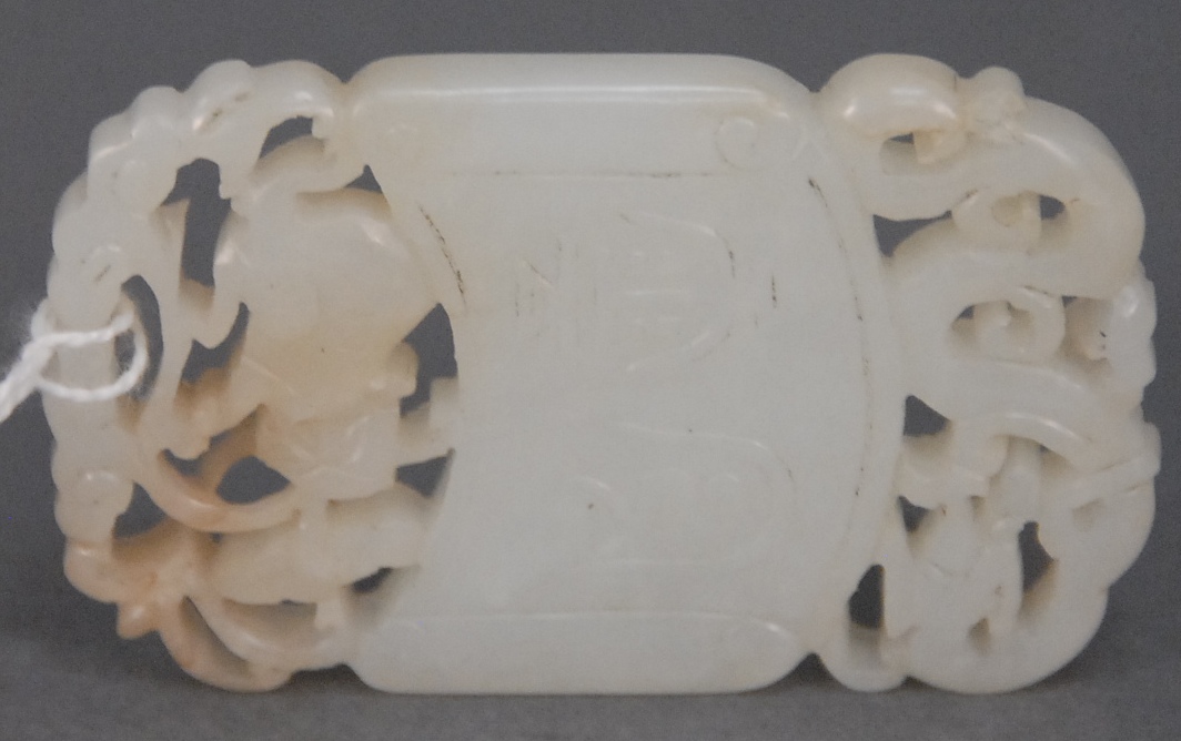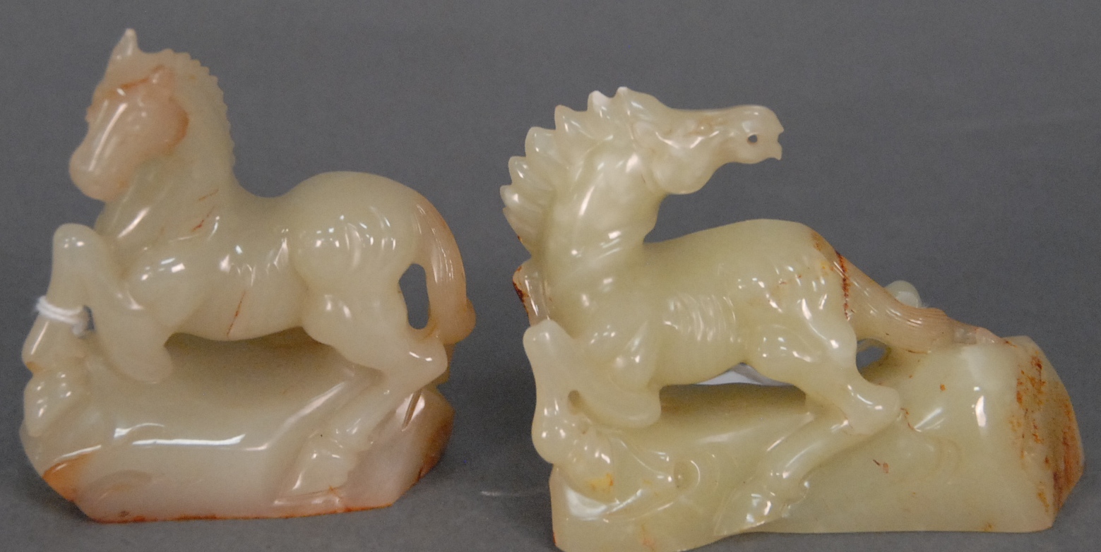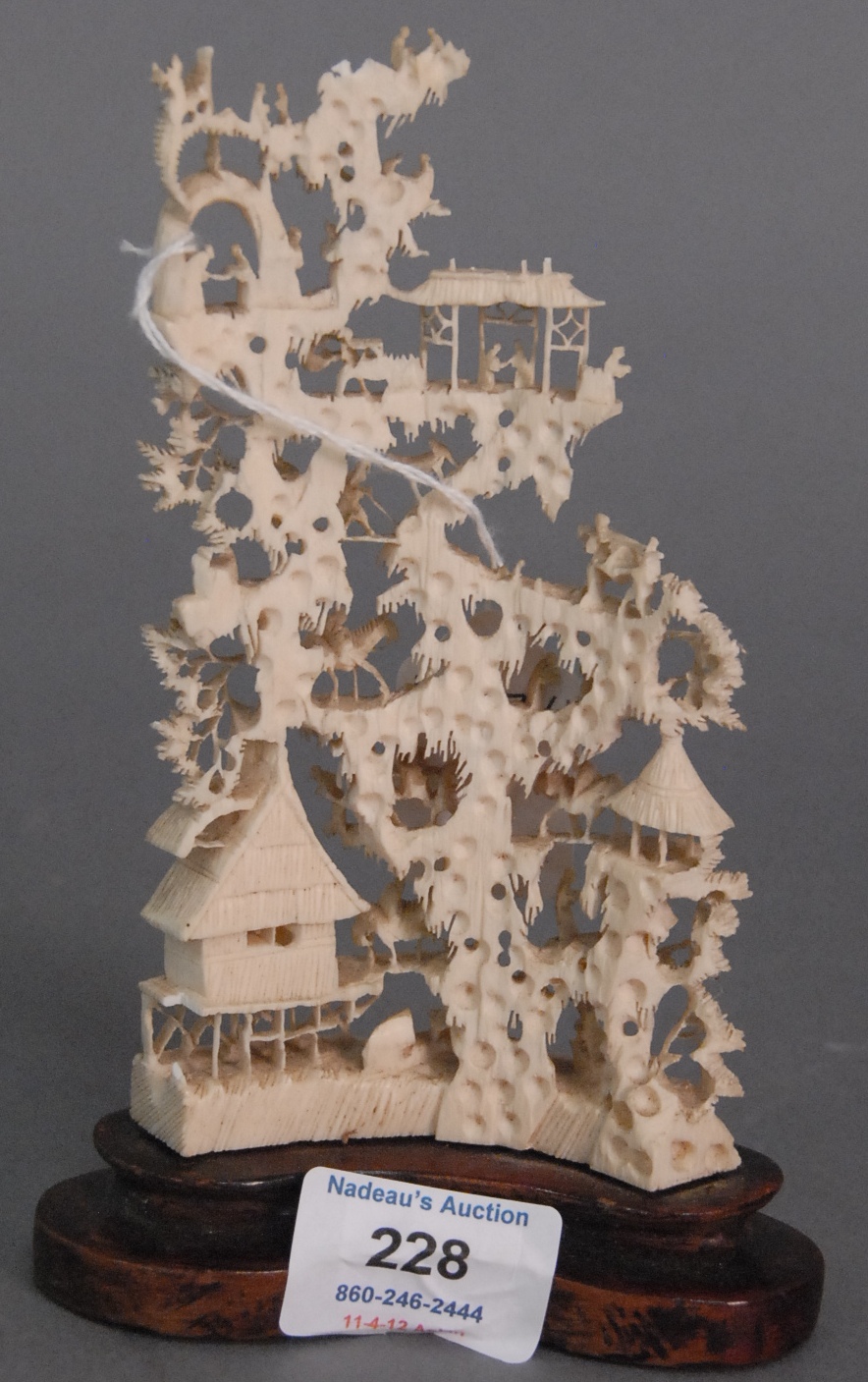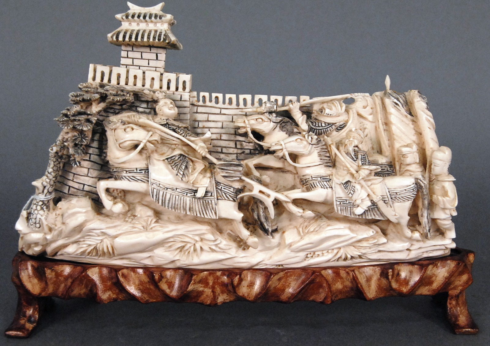 Large carved ivory castle wall having carved warrior figures on horseback fighting with four character mark on bottom, on carved stand, ht. 7in. lg. 11in.