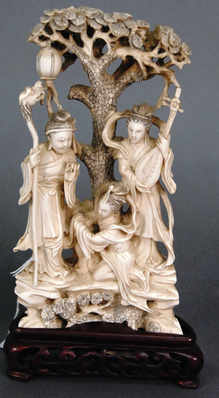 Large carved ivory piece having three carved Guanyin figures standing under a pine tree holding an instrument and staff with dragon head, with character marks on bottom and having carved wood stand, ht. 9in.
