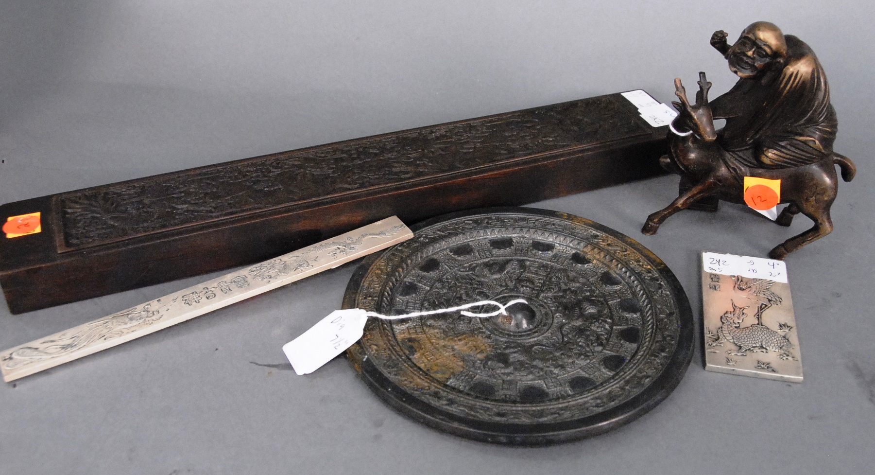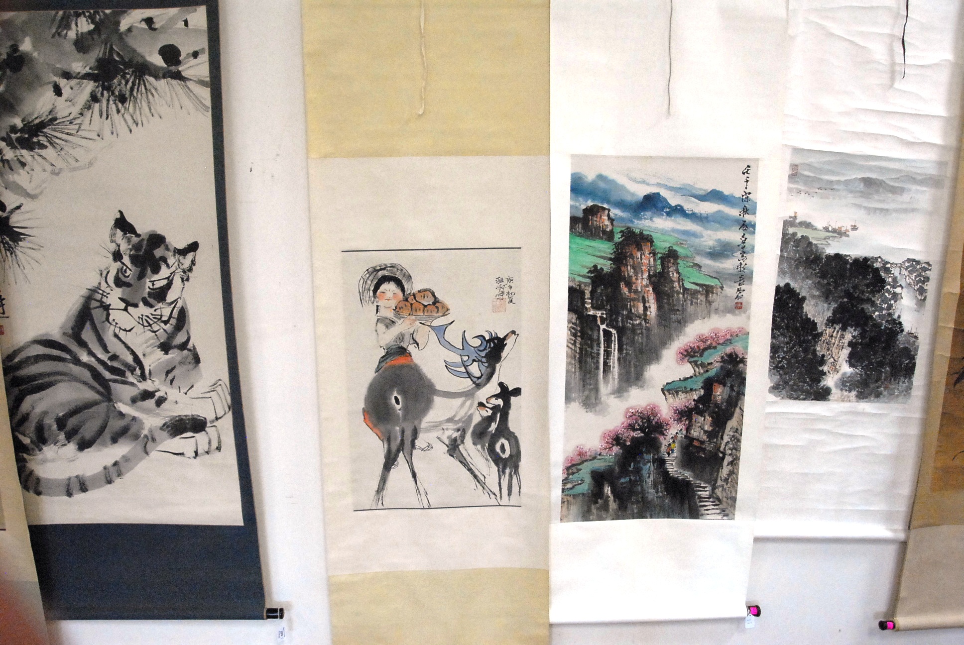 Group of four Oriental scrolls to include watercolor of mountainous landscape with lake, watercolor of mountainous landscape with trail 39 x 19, watercolor of girl on deer 27 x 18, and black and white watercolor of tiger 52 x 25.