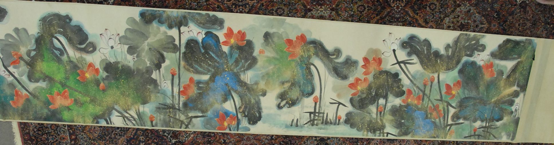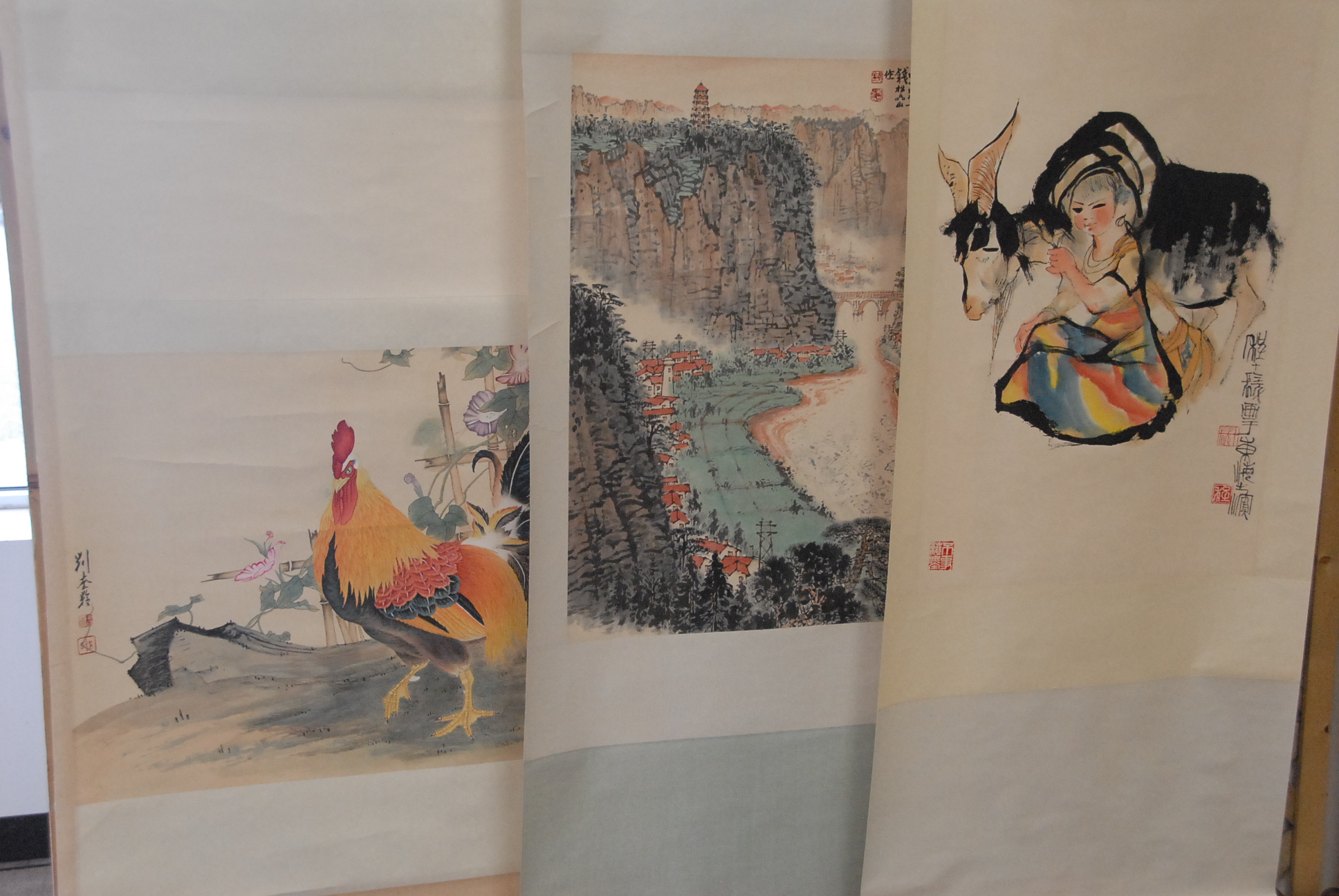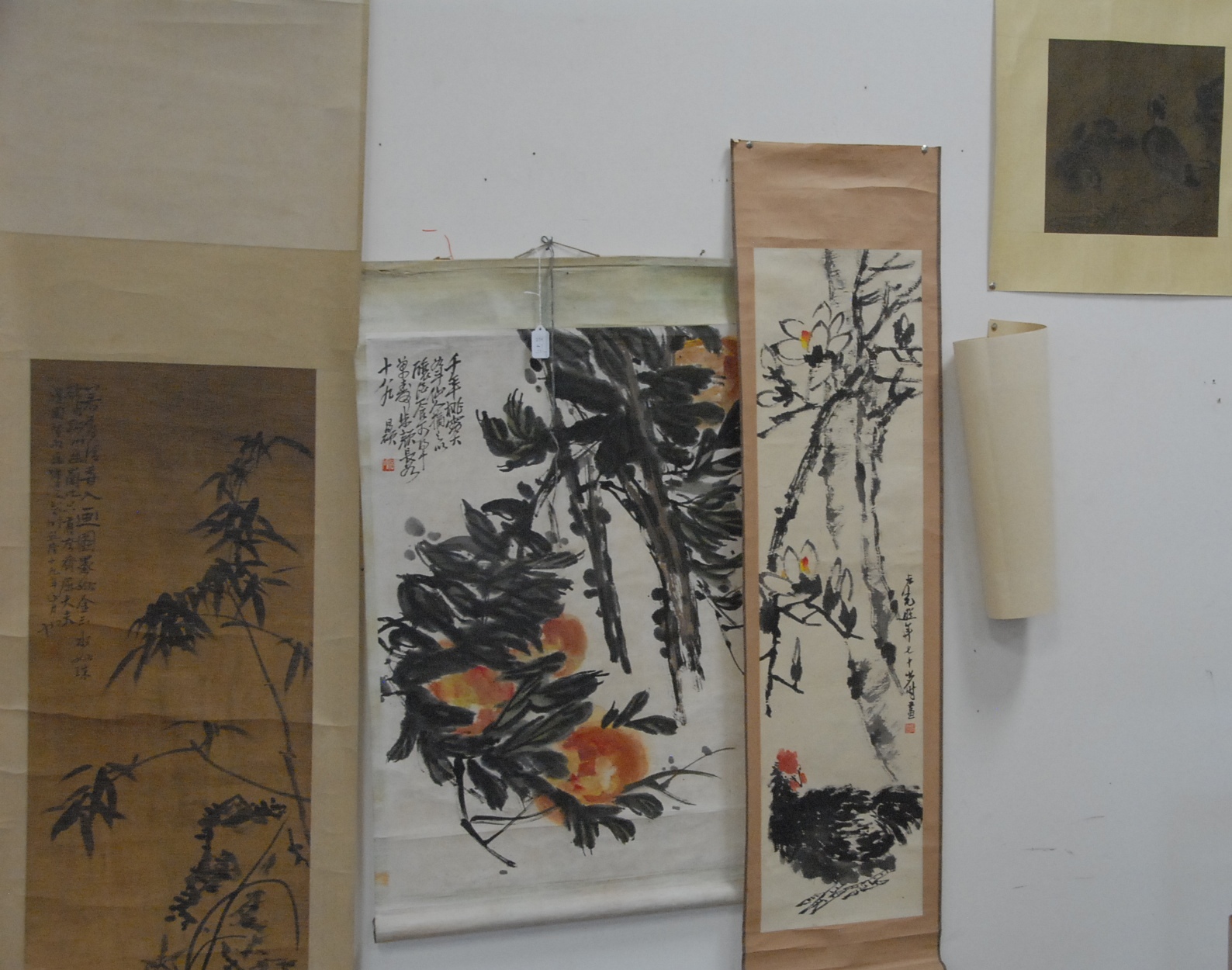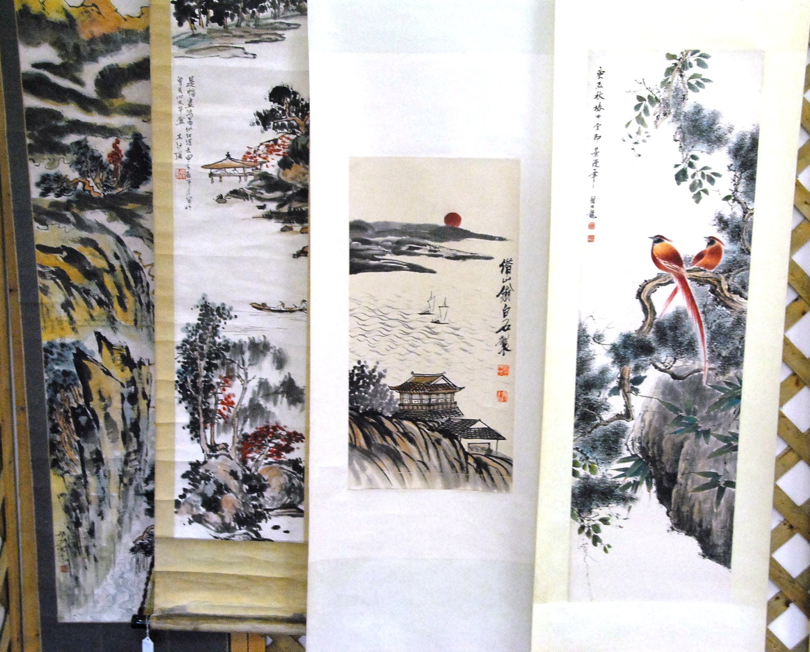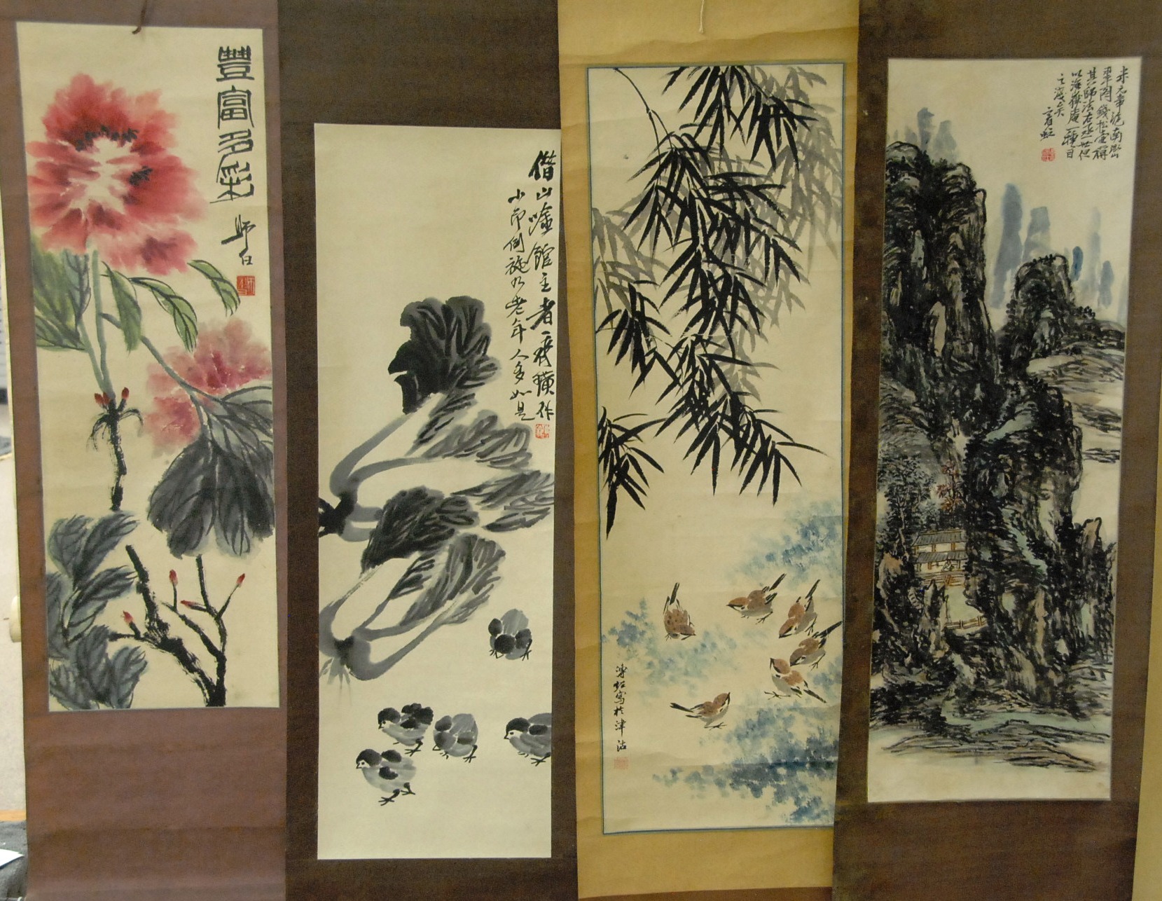 Four Oriental scrolls watercolor of red flower 35 x 15, watercolor of chicks 39 x 12, watercolor of birds and bamboo trees 41 x 13, and watercolor mountainous landscape 39 x 13.