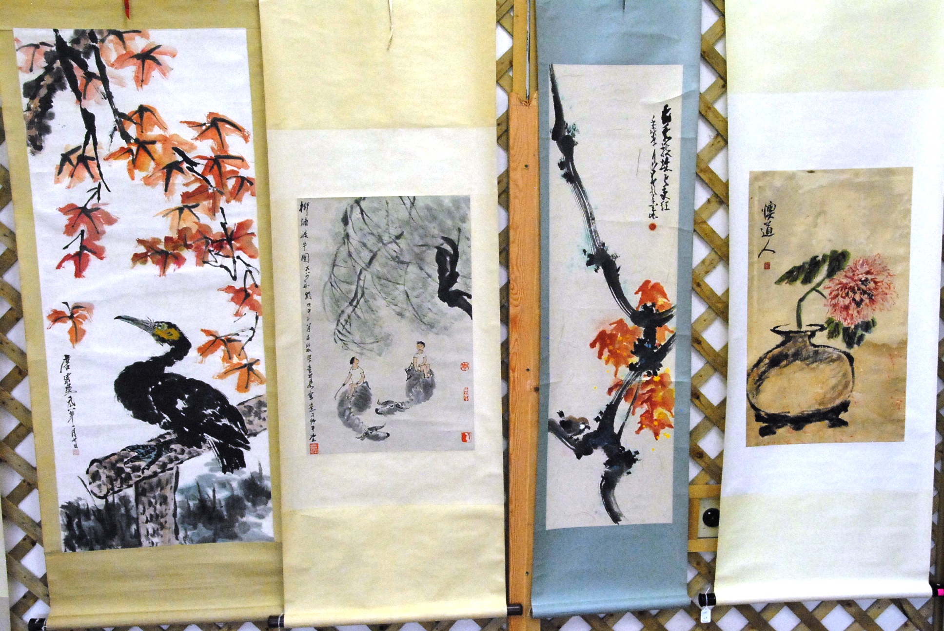Four Oriental scrolls watercolor bird in branch 49 x 14, watercolor still life plant in pot 30 x 16, watercolor two boys on water buffalo 27 x 17, and watercolor duck on log under tree 53 x 22.