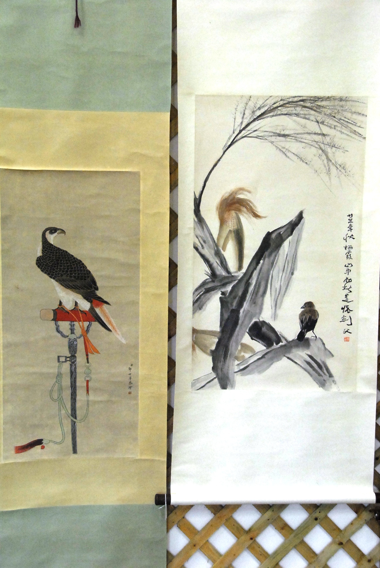 Group of four scrolls watercolor of two birds perched on tree 44 x 13, watercolor house overlooking ocean 27 x 18, watercolor mountainous landscape 49 x 10, and watercolor mountainous landscape 51 x 12 1/2.