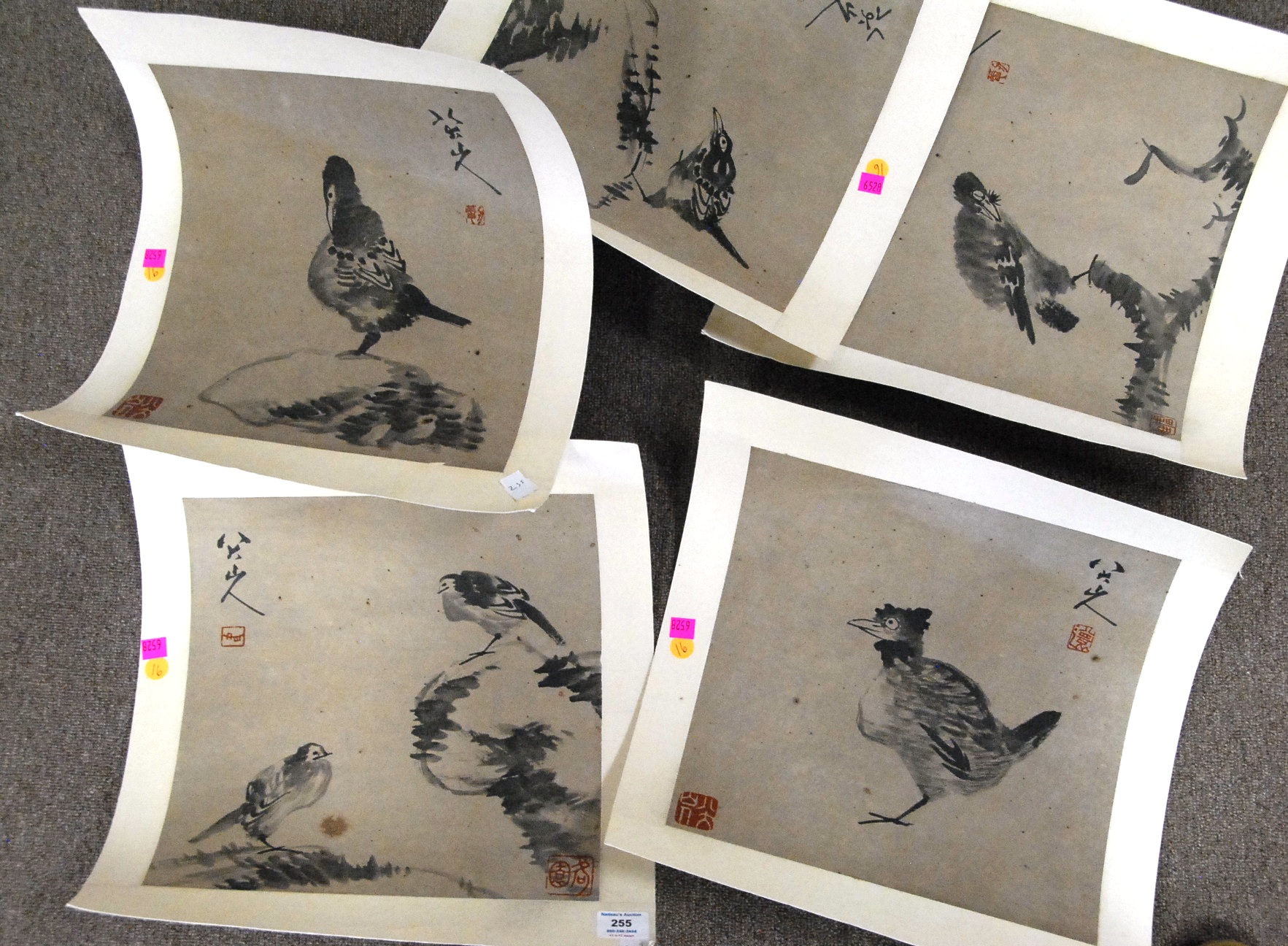 Group of seven Oriental scrolls to include two small silk scrolls of birds, black and white on silk of bamboo trees 41 x 14, black and white on silk of dock 28 1/2 x 13, black and white on silk of birds on branches 36 x 13, watercolor of peach tree 27 x 21, and watercolor of rooster and tree 38 x 10.