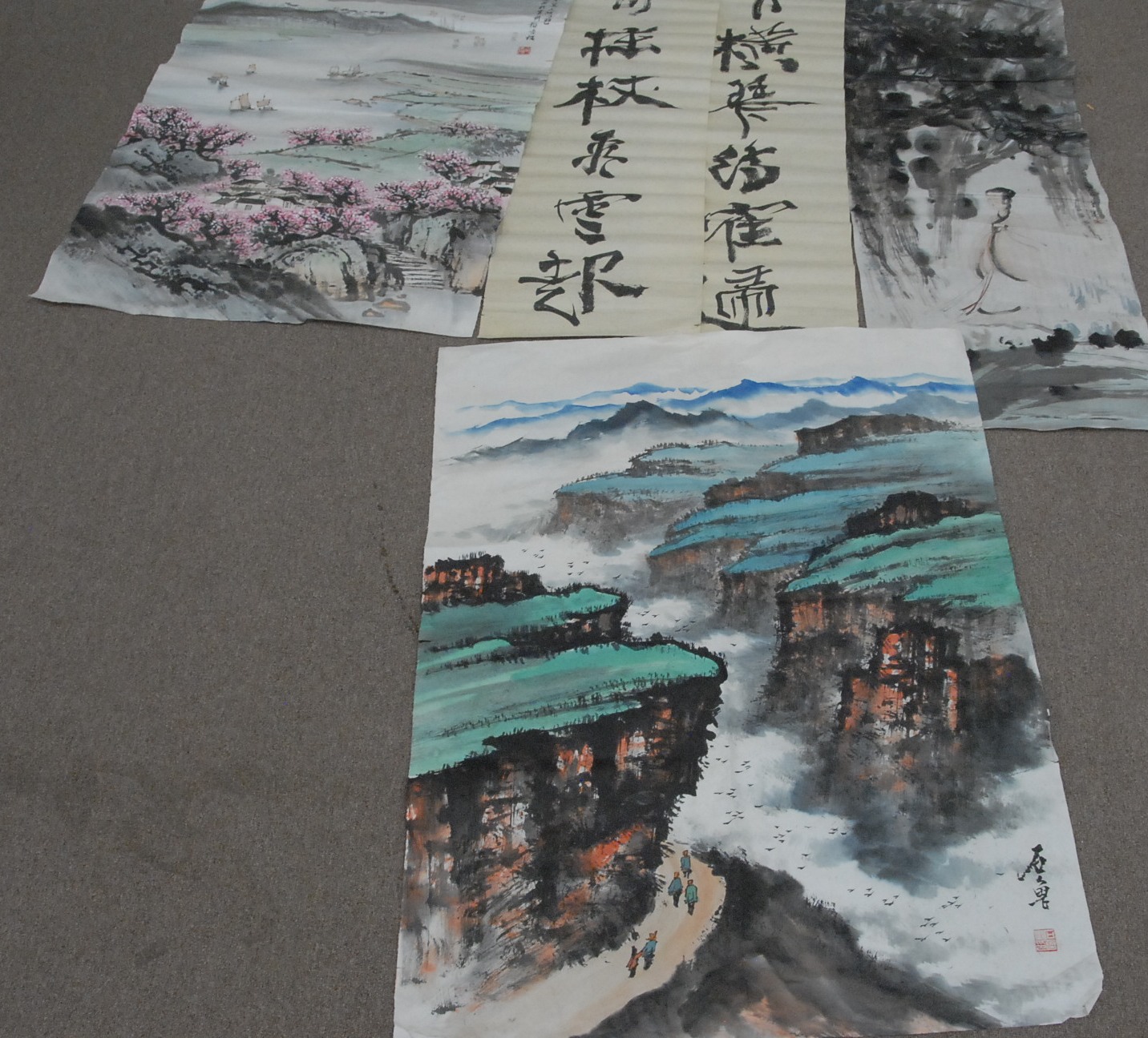 Group of four scrolls watercolor mountainous landscape 26 x 16, watercolor two Guanyin 34 x 19, watercolor stream with rocks 26 x 17, and watercolor characters 27 x 17.