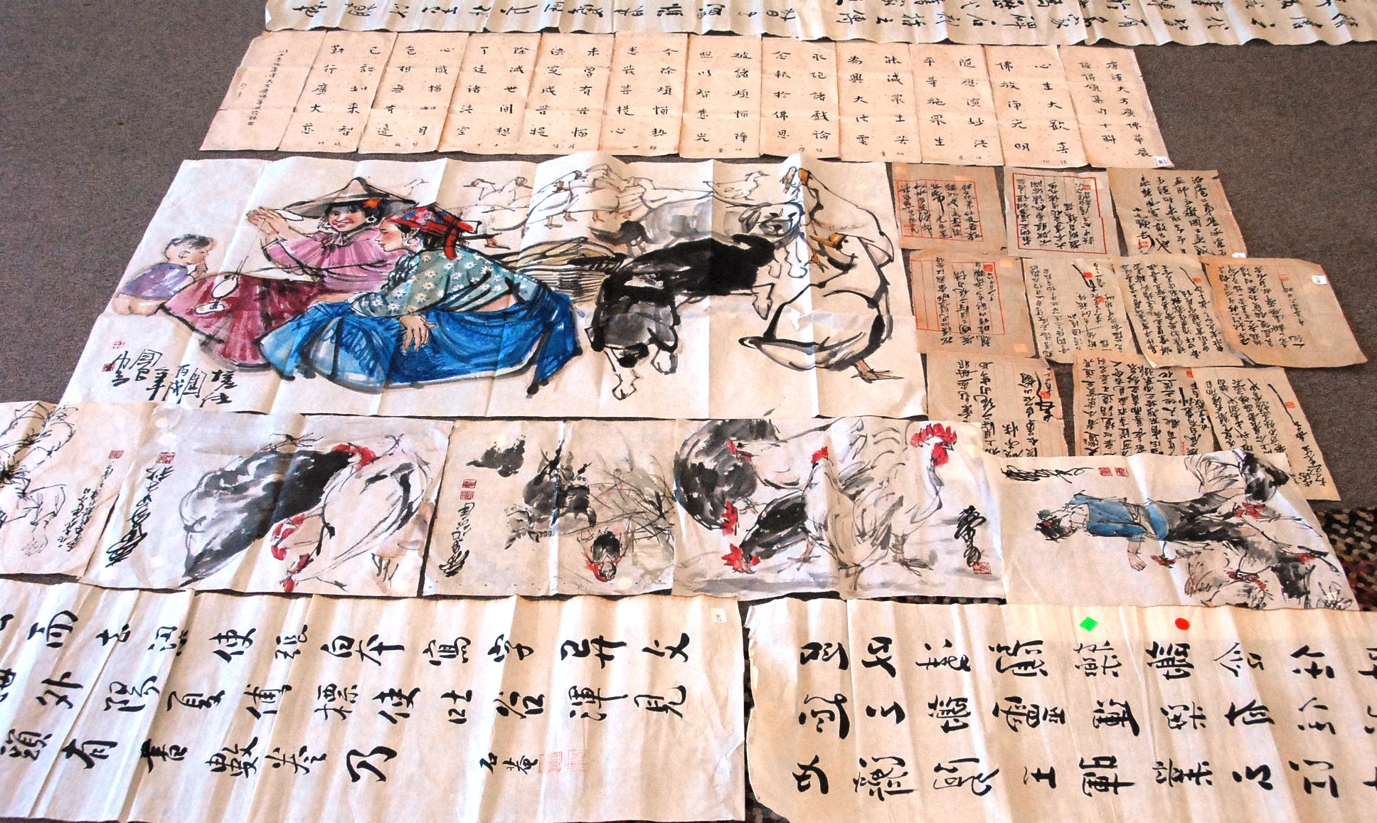 Large group of paintings on tissue paper four of characters 50 x 14, ten small with characters 10 x 8, five small paintings approximately 12 x 15, large folded book 71 x 18, and farm scene with two women and young boy 27 x 53.