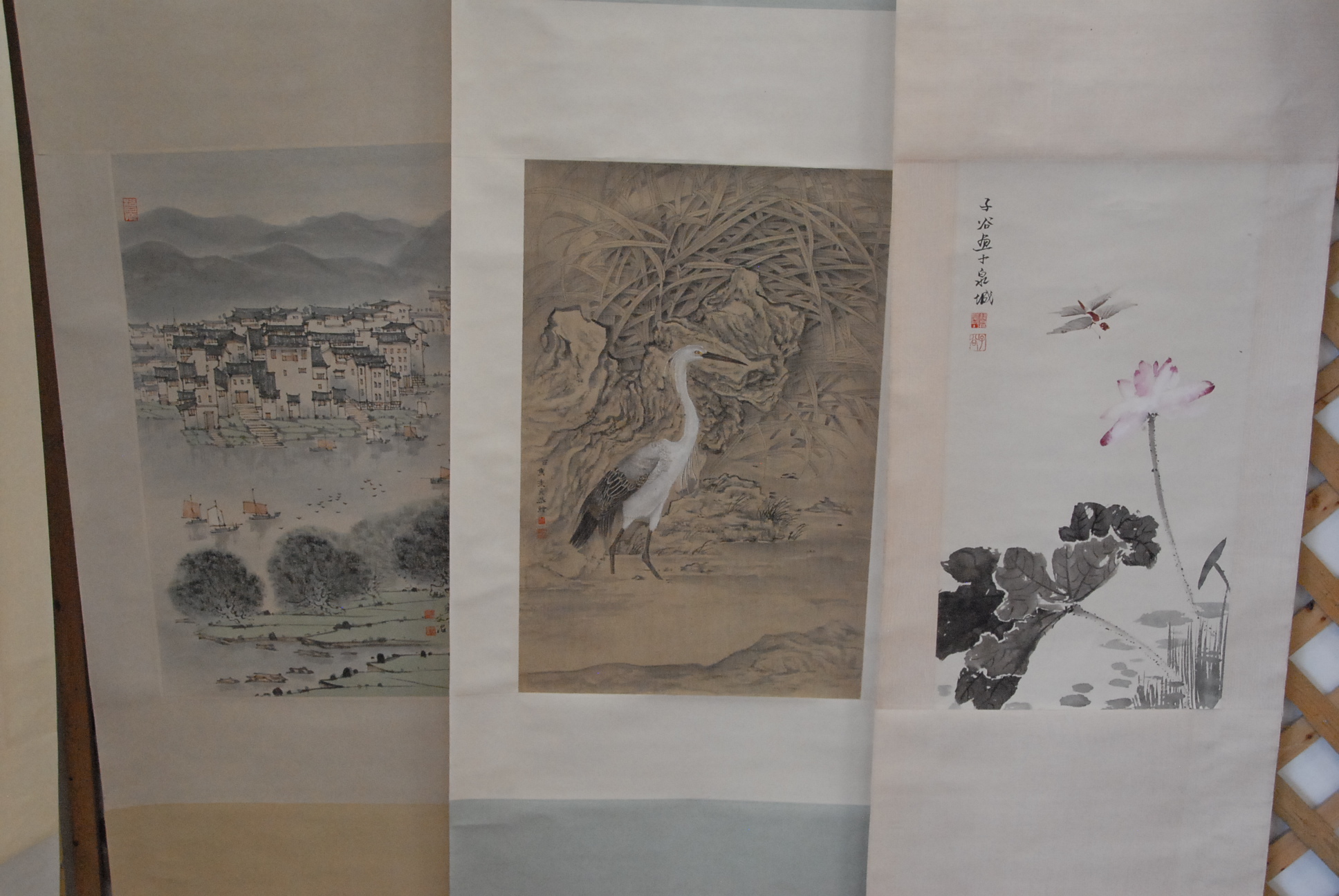 Three Oriental scrolls watercolor on paper of town’s edge 27 x 18, watercolor on silk of crane 25 x 17, watercolor on paper of dragon fly and flower 26 x 18.