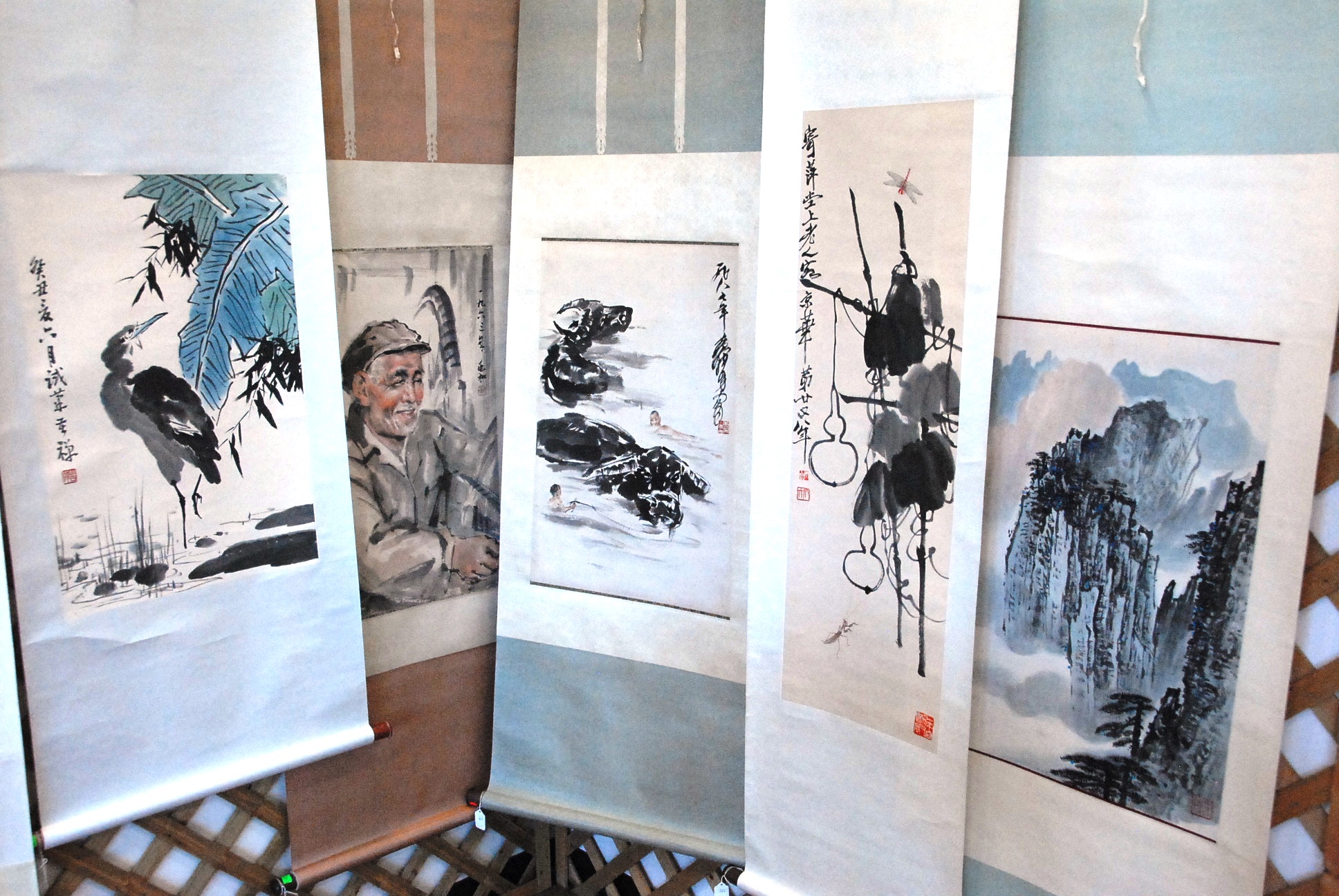 Five Oriental scroll watercolors crane 27 x 17, man 27 x 17, two boys swimming with water buffalo 27 x 17, grasshopper and dragonfly 40 x 12, and landscape 27 x 17.