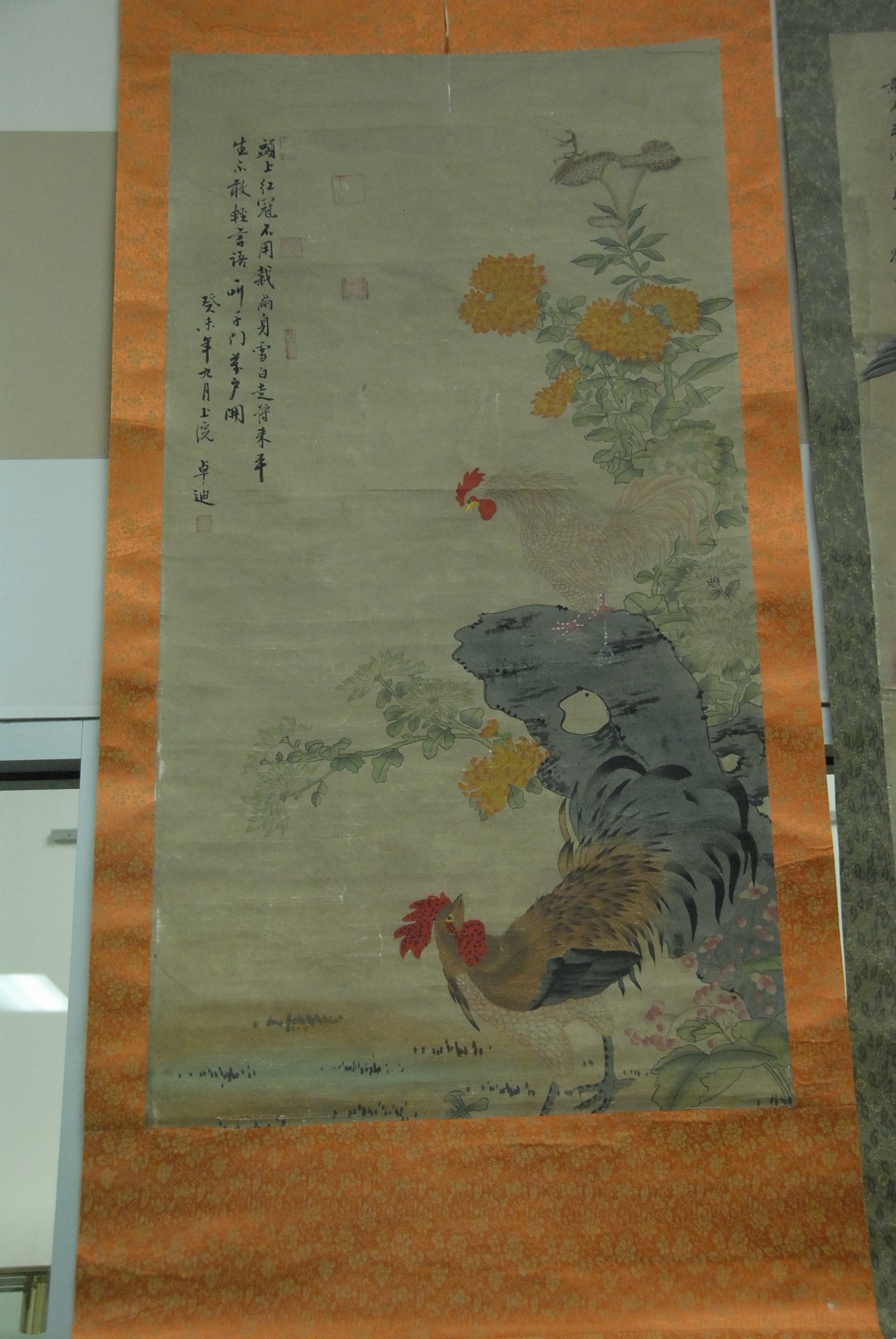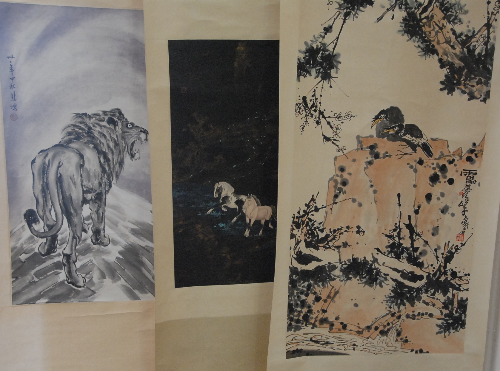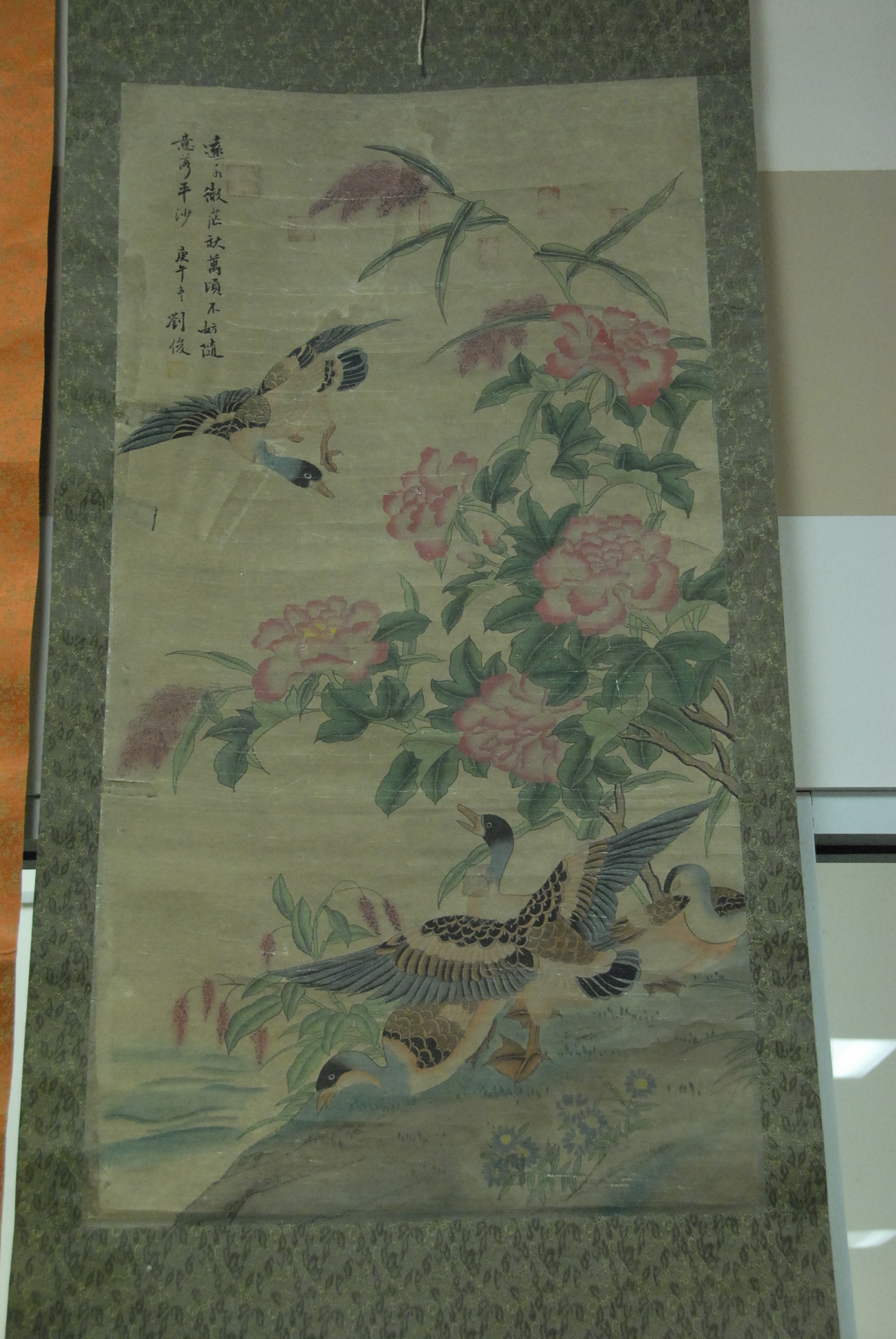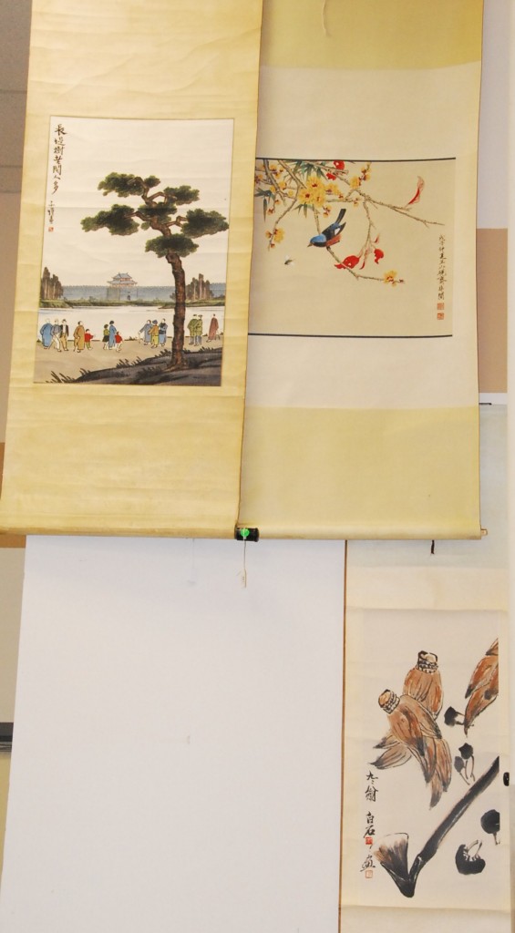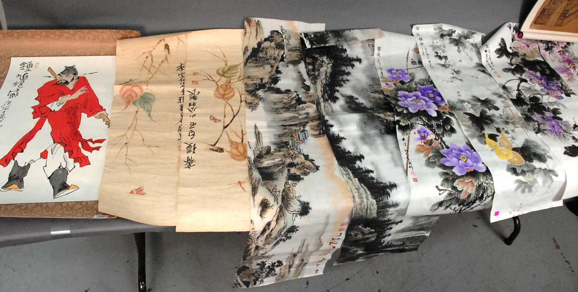 Three Oriental scrolls watercolor on paper landscape 26 x 18, watercolor on paper birds and bug 17 x 20, and watercolor on paper paint brushes 26 x 12.