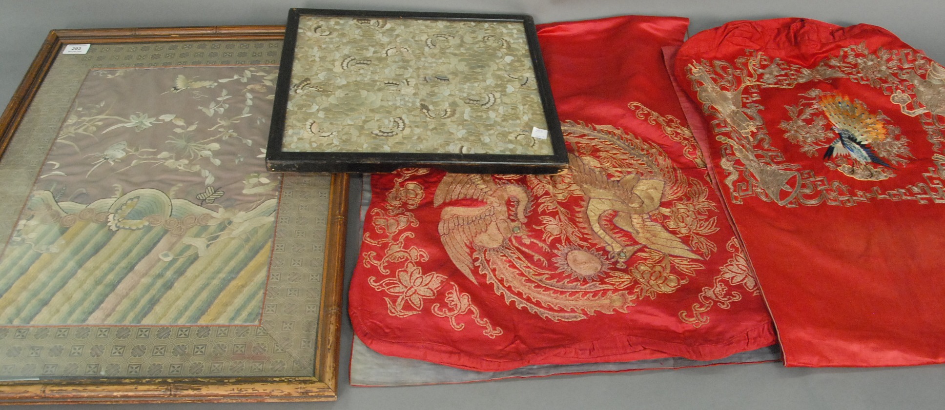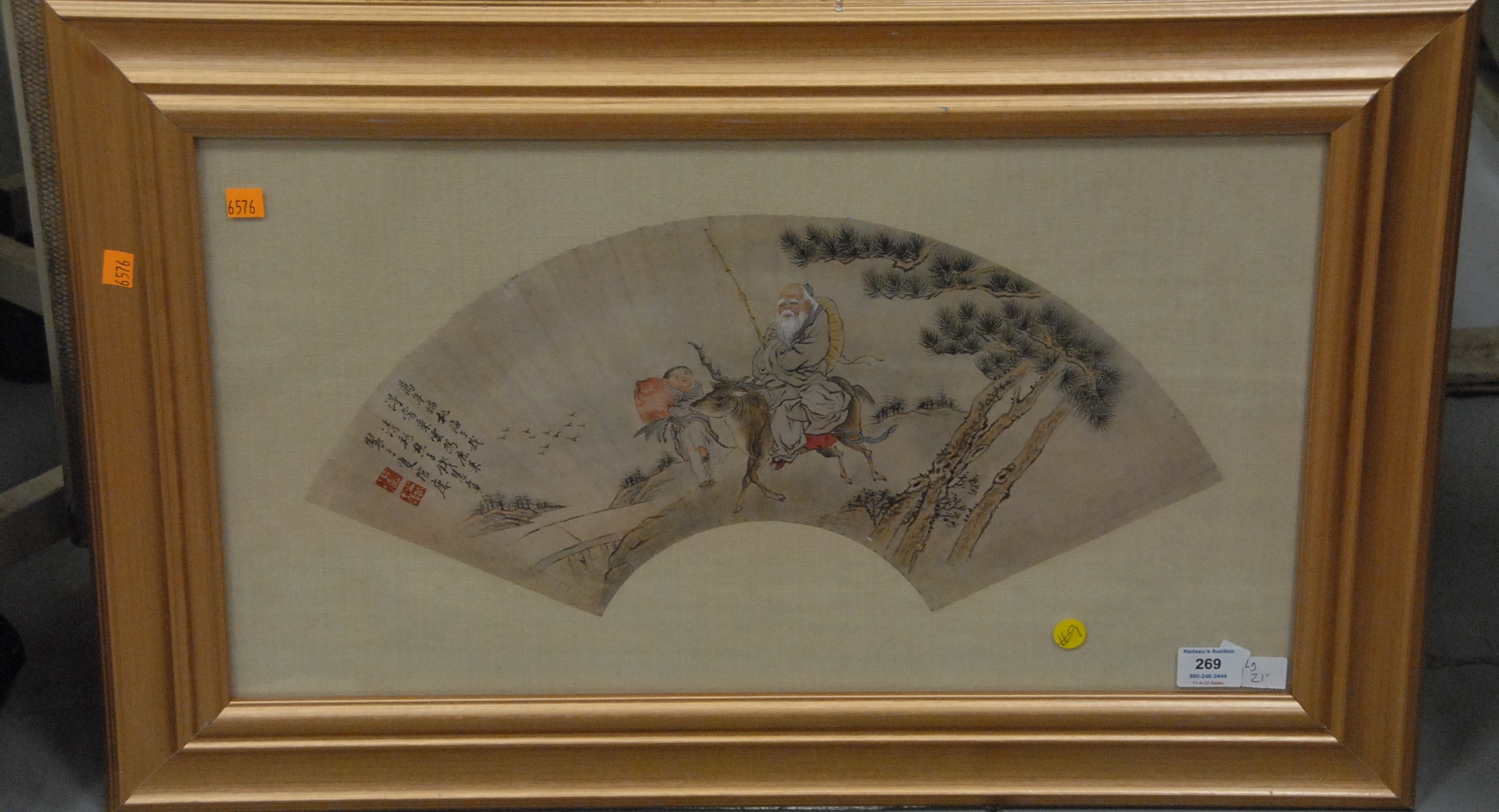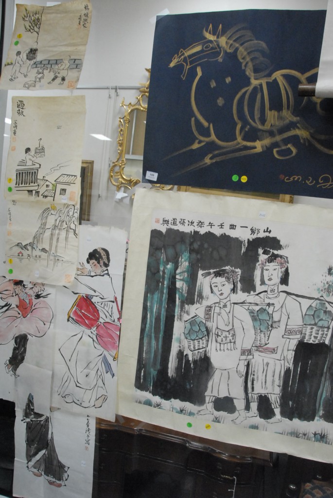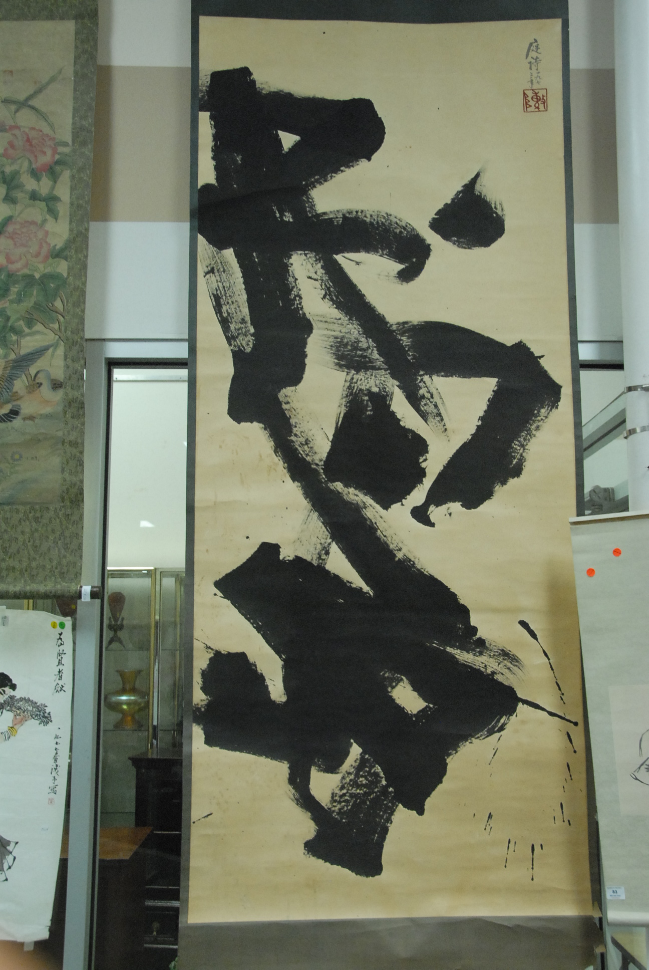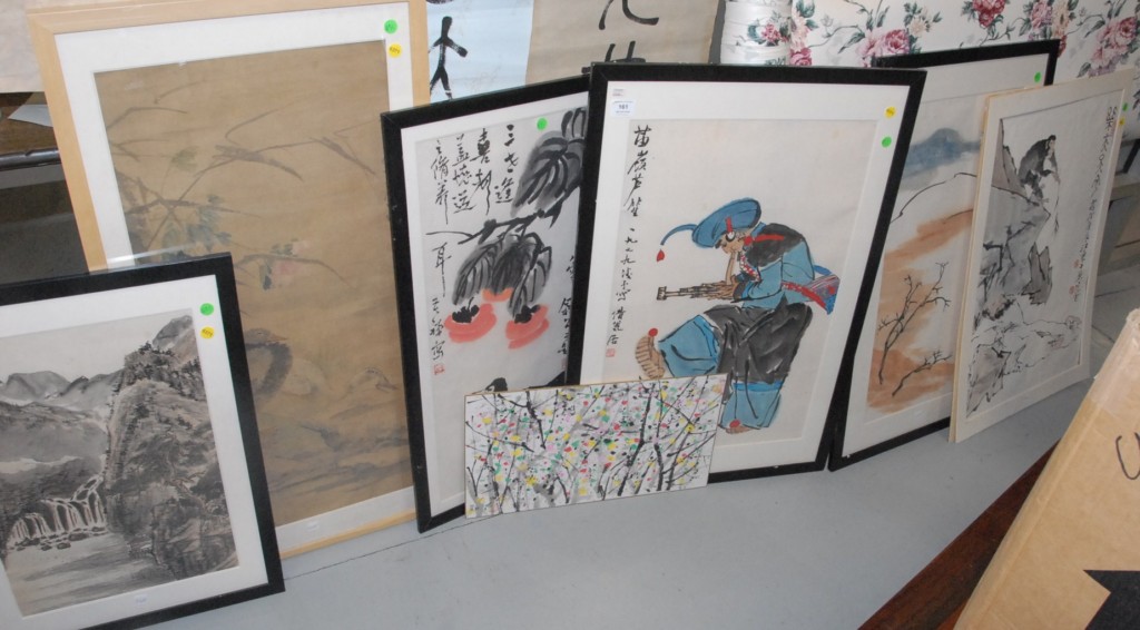 Three Oriental scrolls watercolor on paper landscape 26 x 18, watercolor on paper birds and bug 17 x 20, and watercolor on paper paint brushes 26 x 12.