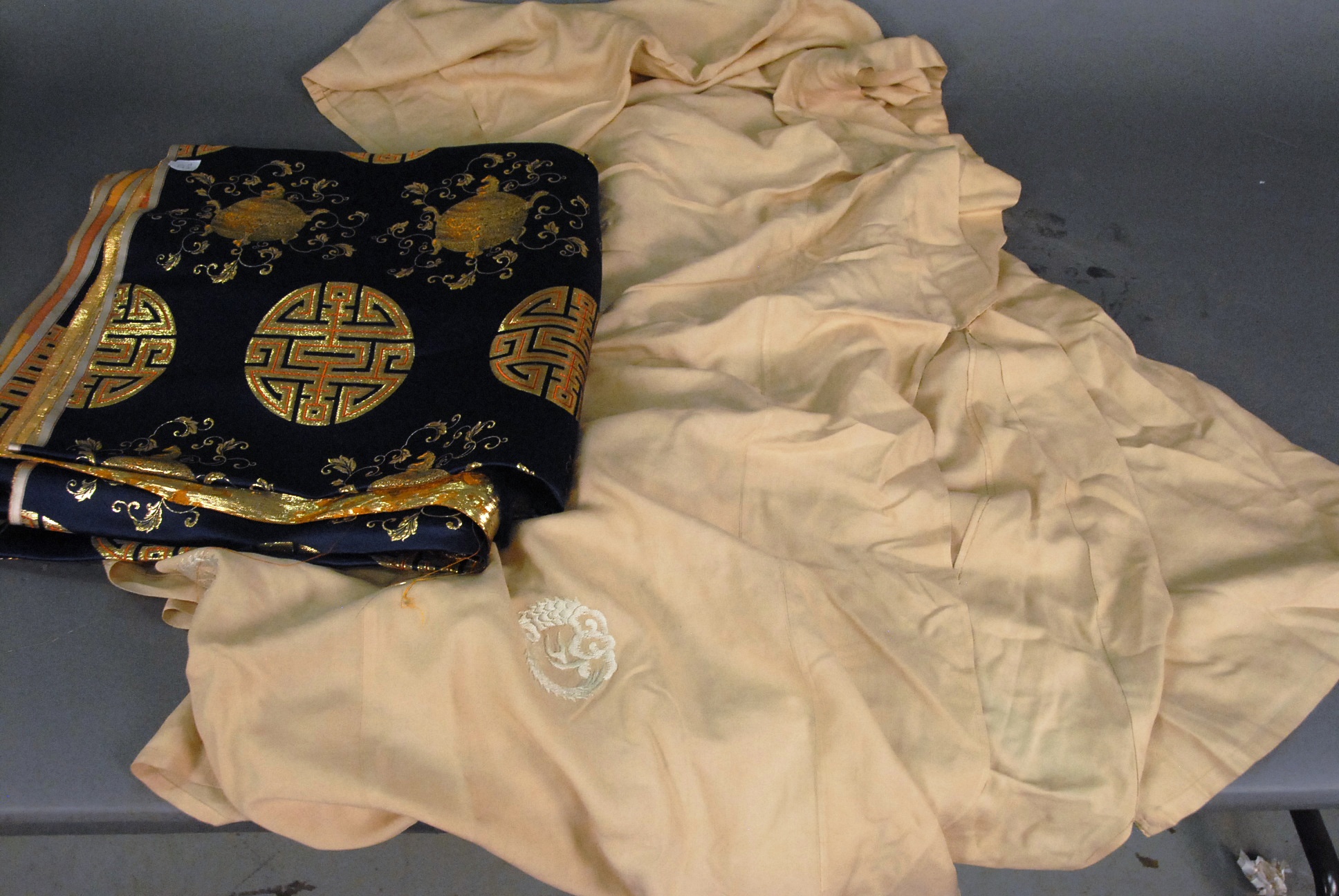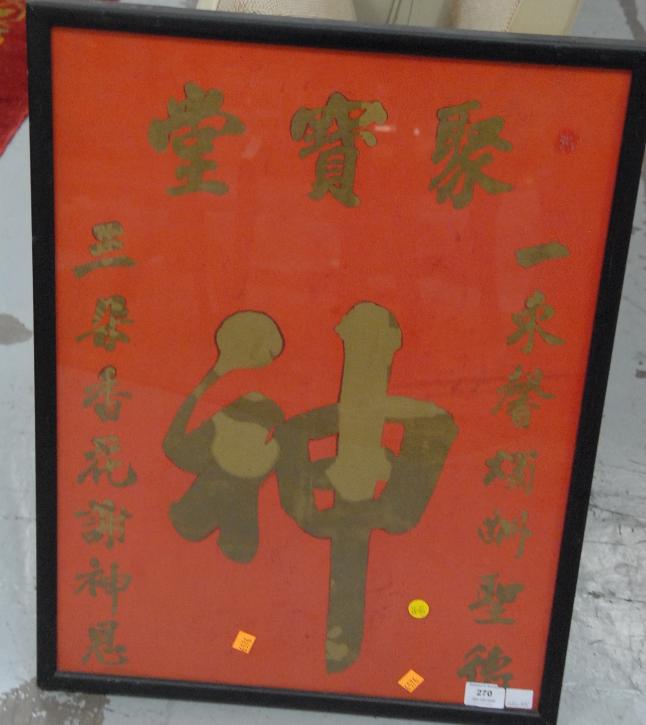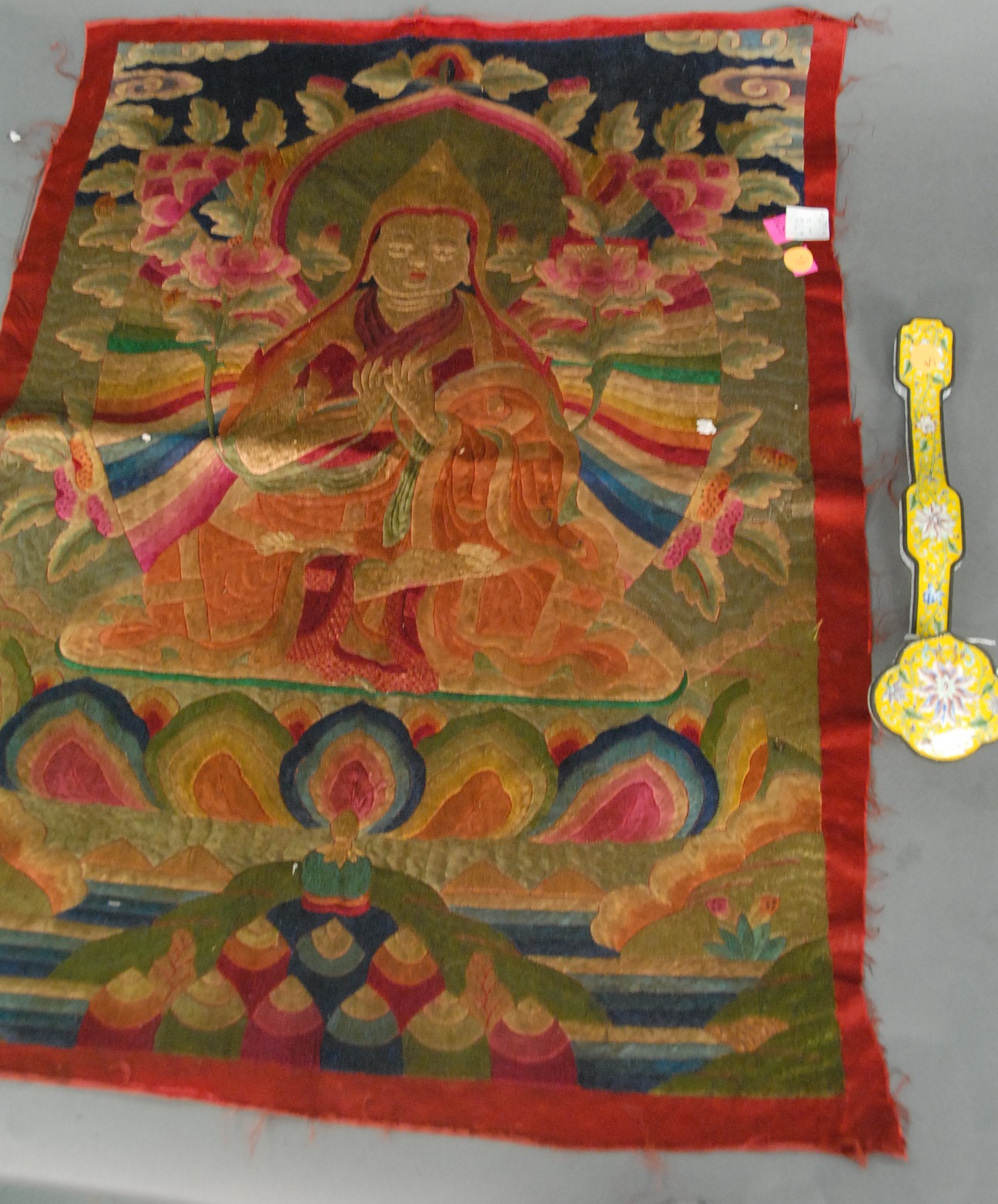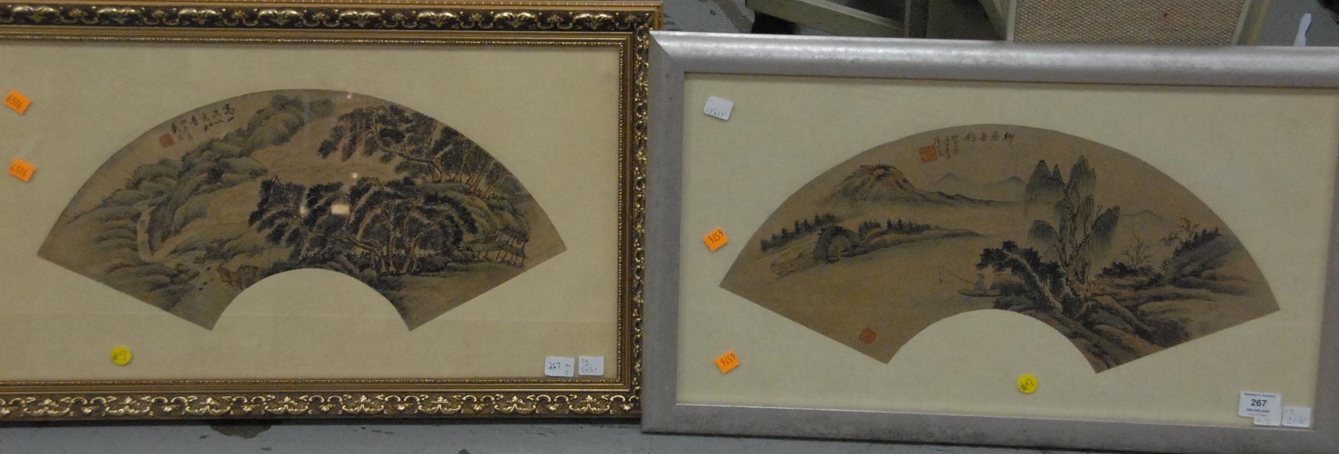 Three Oriental scrolls watercolor on paper landscape 26 x 18, watercolor on paper birds and bug 17 x 20, and watercolor on paper paint brushes 26 x 12.