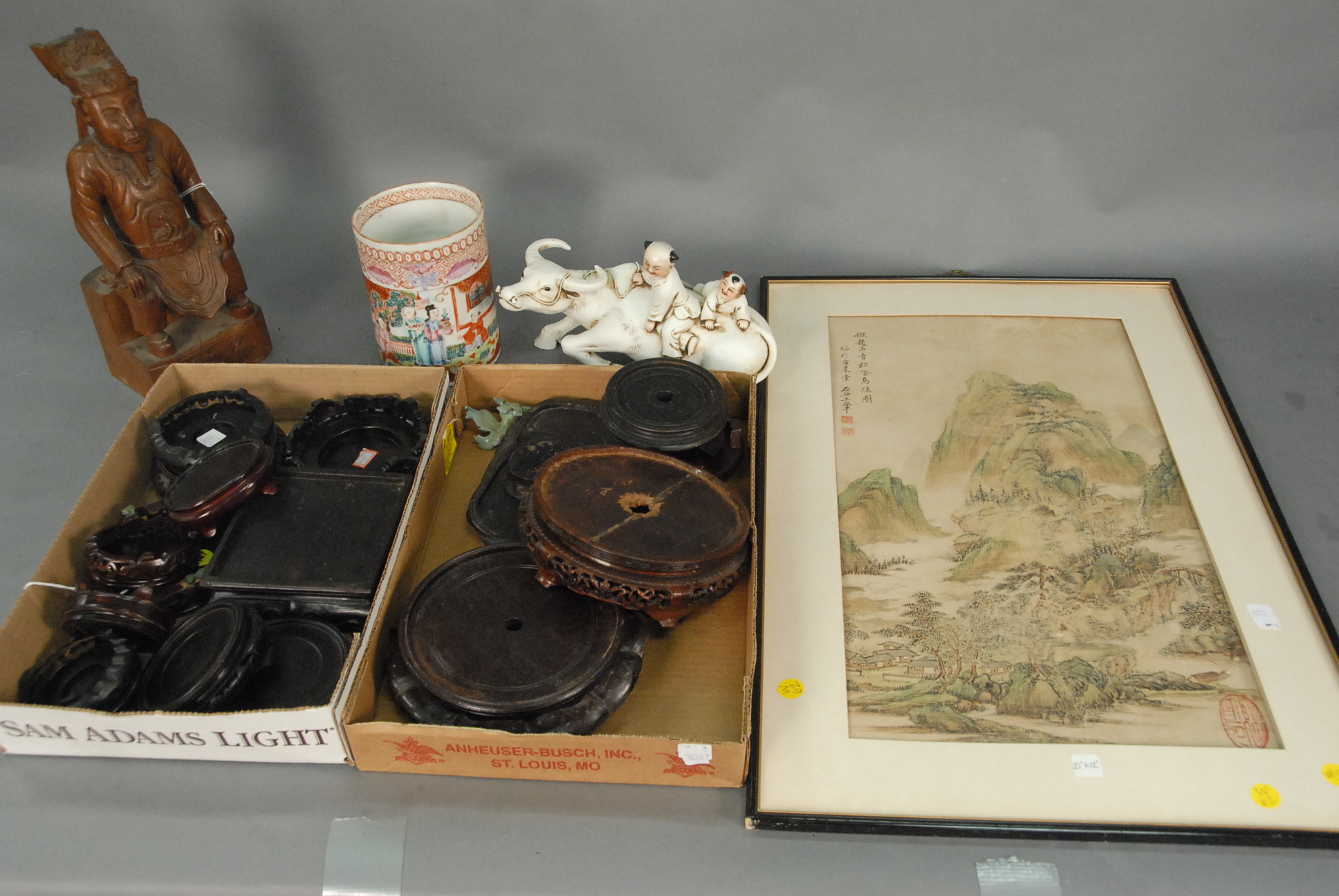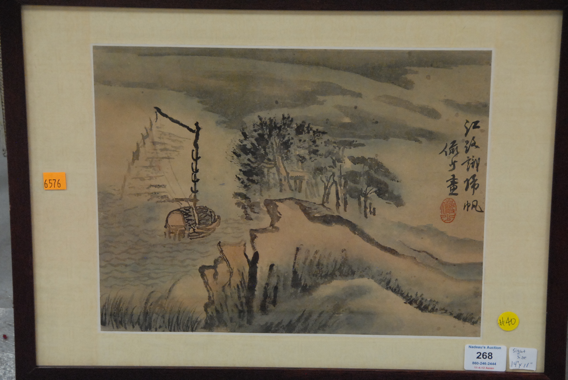 Group of seven watercolors on paper and silk, five are framed, two are not one of figure playing instrument 26 x 17, one of landscape 19 x 13, landscape with water buffalo 26 x 14, abstract 11 x 19, monkey playing with man sleeping 27 x 18, duck 27 x 13, and watercolor on silk of duck 31 x 15.