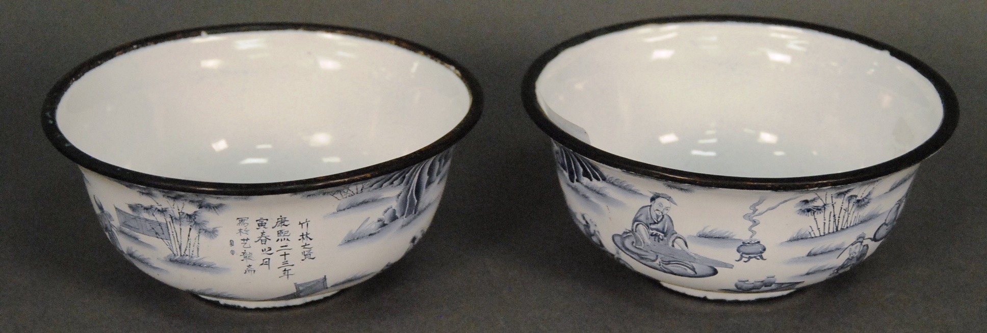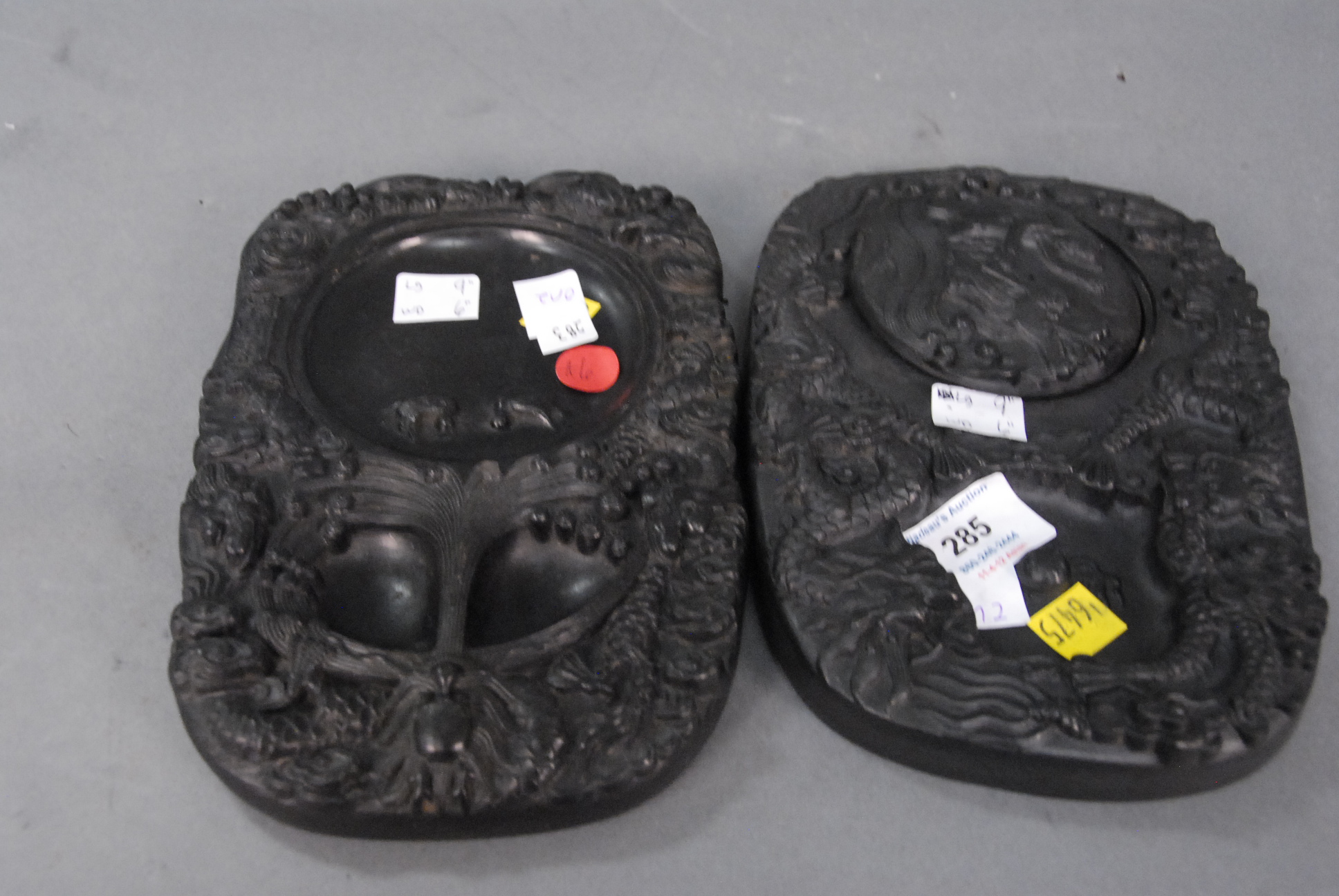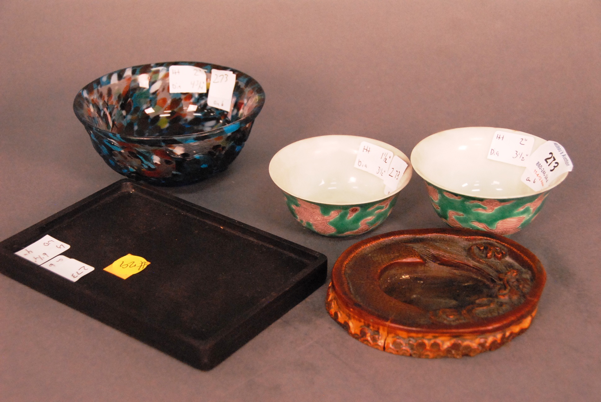 Group of six pieces to include pair of cups ht. 1 1/2in. dia. 3 1/2in., silver overlaid dragon dish, multicolor bowl, ink stone, and bamboo water coupe with dragon.