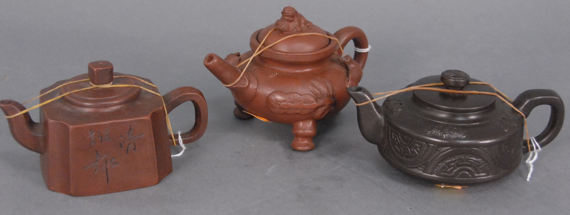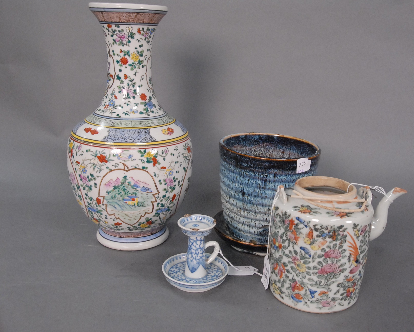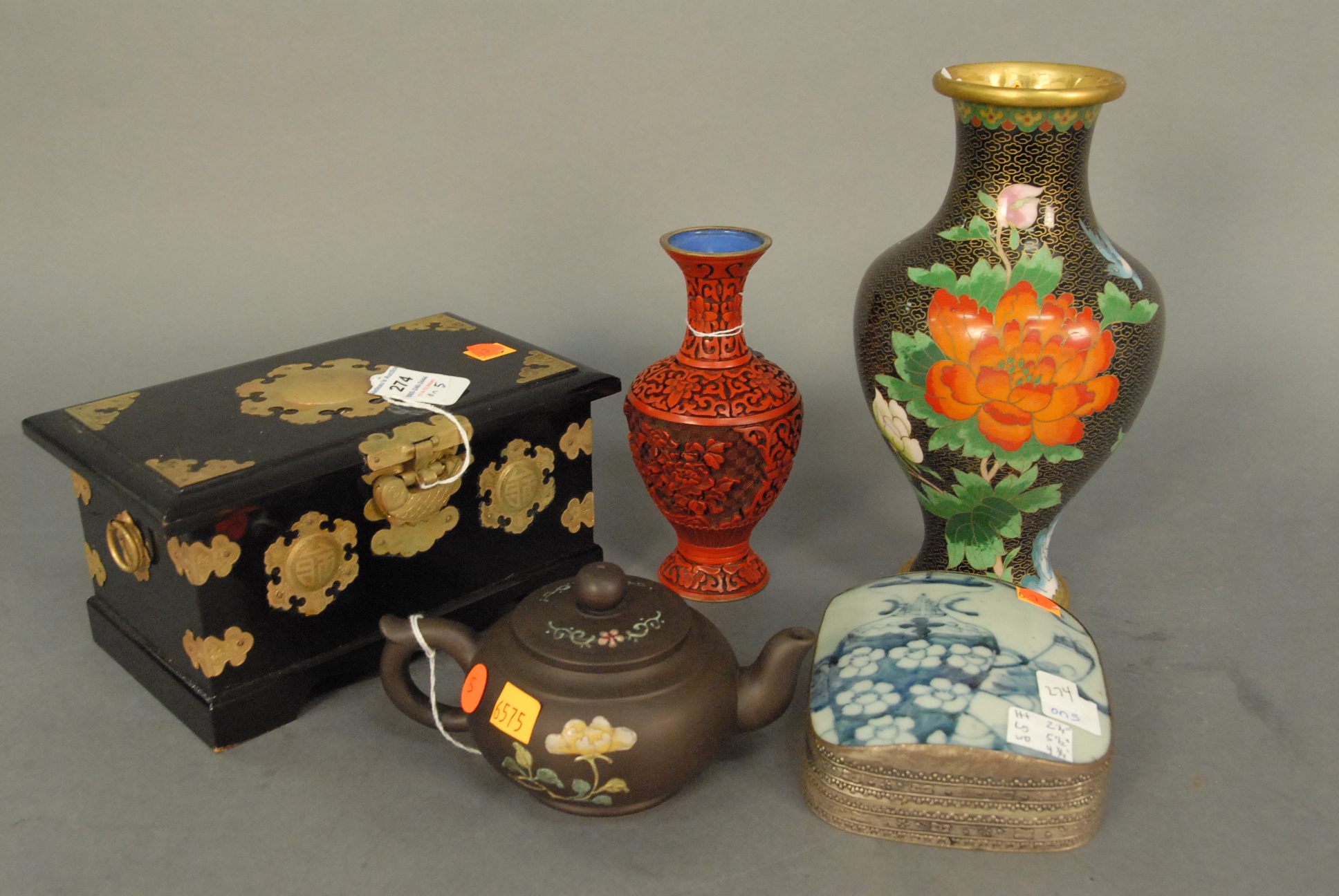 Group of five items small porcelain teapot with enameled flowers and butterfly and four character mark on bottom ht. 3 1/2in., small blue and white jewelry box ht. 2in. lg. 5 1/2in. wd. 4 1/2in., cloisonn vase with flowers ht. 10 1/2in., small cinnabar vase ht. 7in., and black lacquer jewelry box ht. 4 3/4in. lg. 9in. wd. 5 3/4in.